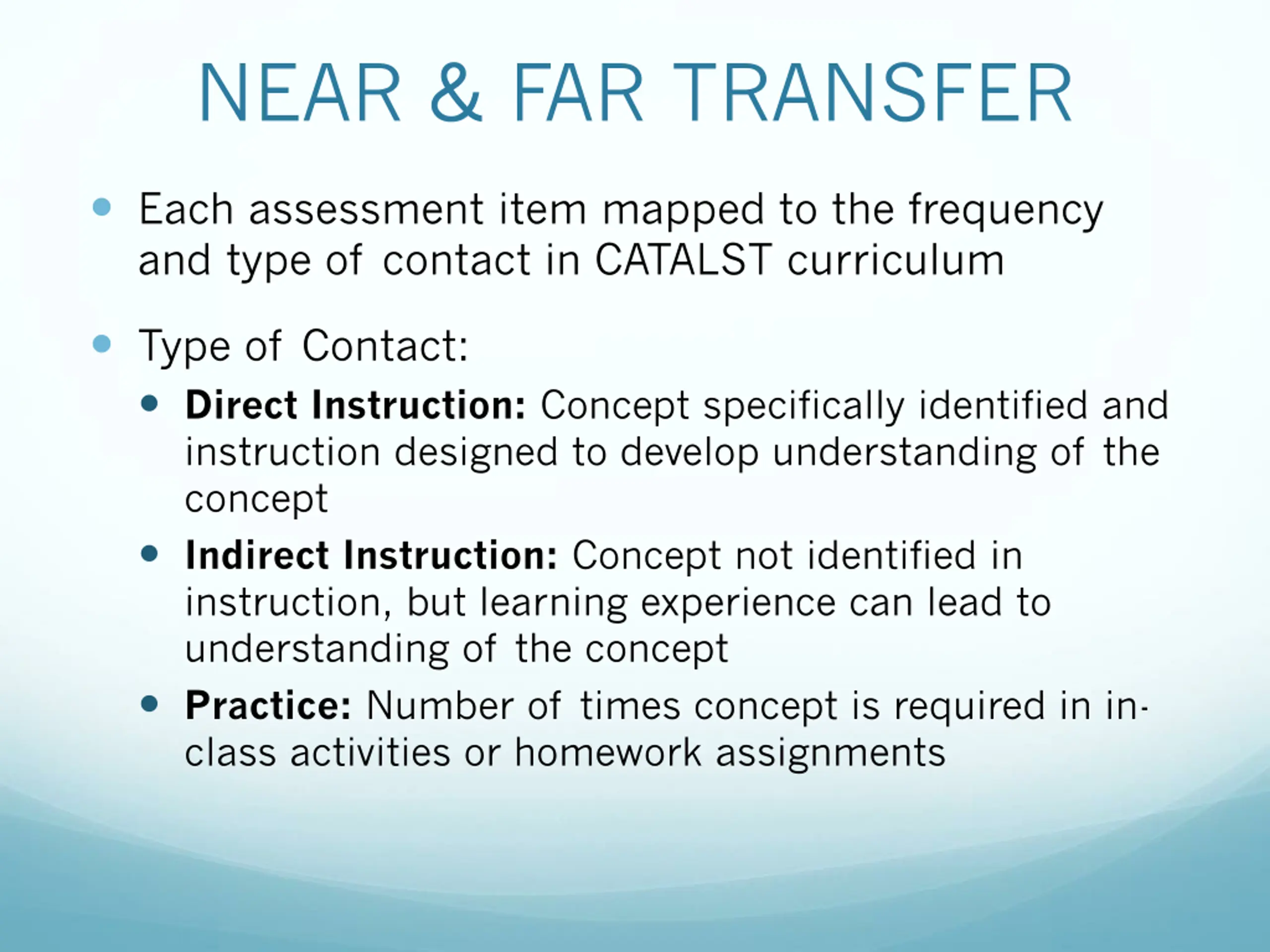 NEAR & FAR TRANSFER Each assessment item mapped to the frequency and type of contact in CATALST curriculum Type of Contact: Direct Instruction: Concept specifically identified and instruction designed to develop understanding of the concept Indirect Instruction: Concept not identified in instruction, but learning experience can lead to understanding of the concept Practice: Number of times concept is required in in- class activities or homework assignments