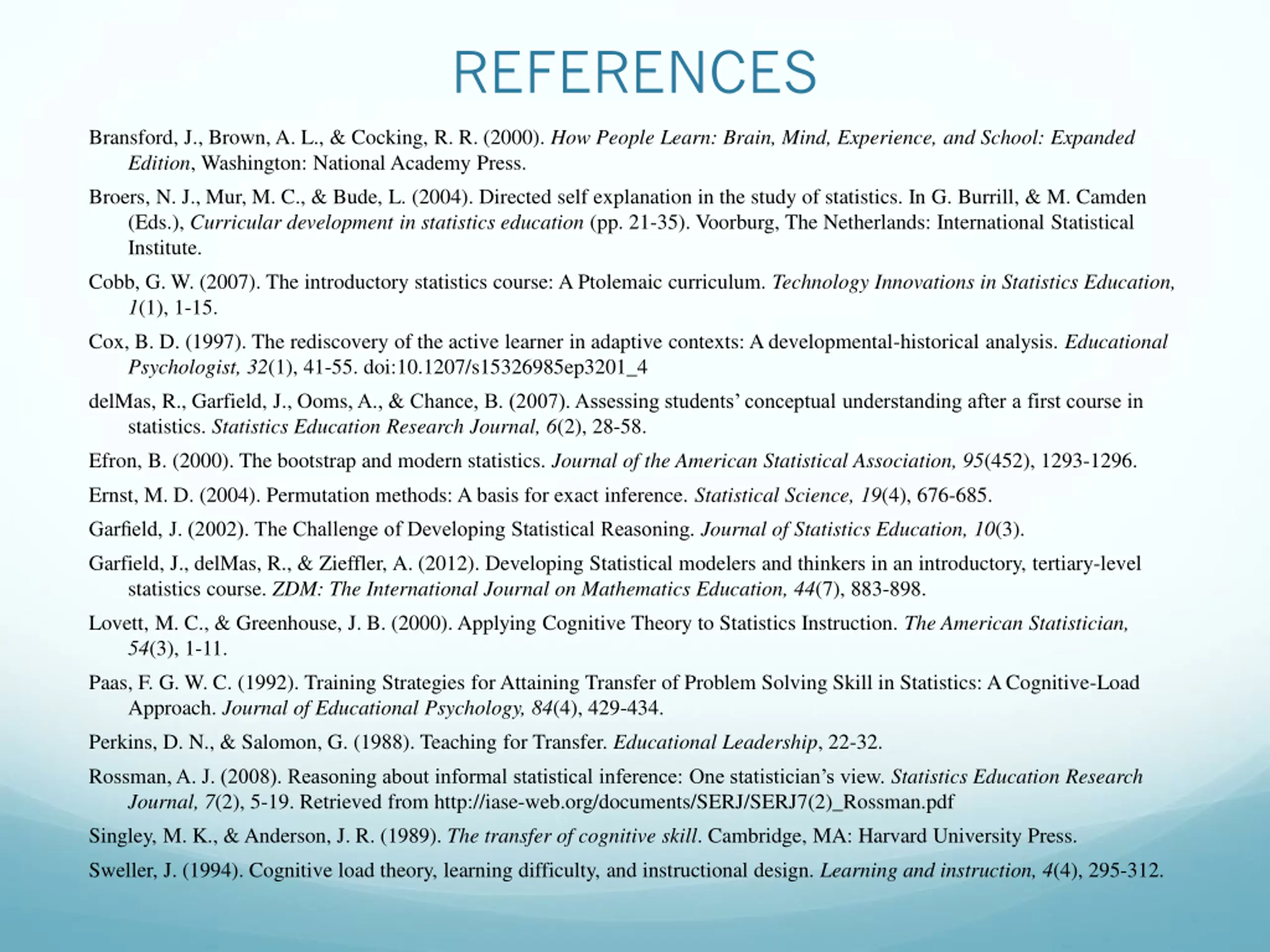 REFERENCES Bransford, J., Brown, A. L., & Cocking, R. R. (2000). How People Learn: Brain, Mind, Experience, and School: Expanded Edition, Washington: National Academy Press. Broers, N. J., Mur, M. C., & Bude, L. (2004). Directed self explanation in the study of statistics. In G. Burrill, & M. Camden (Eds.), Curricular development in statistics education (pp. 21-35). Voorburg, The Netherlands: International Statistical Institute. Cobb, G. W. (2007). The introductory statistics course: A Ptolemaic curriculum. Technology Innovations in Statistics Education, 1(1), 1-15. Cox, B. D. (1997). The rediscovery of the active learner in adaptive contexts: A developmental-historical analysis. Educational Psychologist, 32(1), 41-55. doi:10.1207/s15326985ep3201_4 delMas, R., Garfield, J., Ooms, A., & Chance, B. (2007). Assessing students conceptual understanding after a first course in statistics. Statistics Education Research Journal, 6(2), 28-58. Efron, B. (2000). The bootstrap and modern statistics. Journal of the American Statistical Association, 95(452), 1293-1296. Ernst, M. D. (2004). Permutation methods: A basis for exact inference. Statistical Science, 19(4), 676-685. Garfield, J. (2002). The Challenge of Developing Statistical Reasoning. Journal of Statistics Education, 10(3). Garfield, J., delMas, R., & Zieffler, A. (2012). Developing Statistical modelers and thinkers in an introductory, tertiary-level statistics course. ZDM: The International Journal on Mathematics Education, 44(7), 883-898. Lovett, M. C., & Greenhouse, J. B. (2000). Applying Cognitive Theory to Statistics Instruction. The American Statistician, 54(3), 1-11. Paas, F. G. W. C. (1992). Training Strategies for Attaining Transfer of Problem Solving Skill in Statistics: A Cognitive-Load Approach. Journal of Educational Psychology, 84(4), 429-434. Perkins, D. N., & Salomon, G. (1988). Teaching for Transfer. Educational Leadership, 22-32. Rossman, A. J. (2008). Reasoning about informal statistical inference: One statistician s view. Statistics Education Research Journal, 7(2), 5-19. Retrieved from http://iase-web.org/documents/SERJ/SERJ7(2)_Rossman.pdf Singley, M. K., & Anderson, J. R. (1989). The transfer of cognitive skill. Cambridge, MA: Harvard University Press. Sweller, J. (1994). Cognitive load theory, learning difficulty, and instructional design. Learning and instruction, 4(4), 295-312.