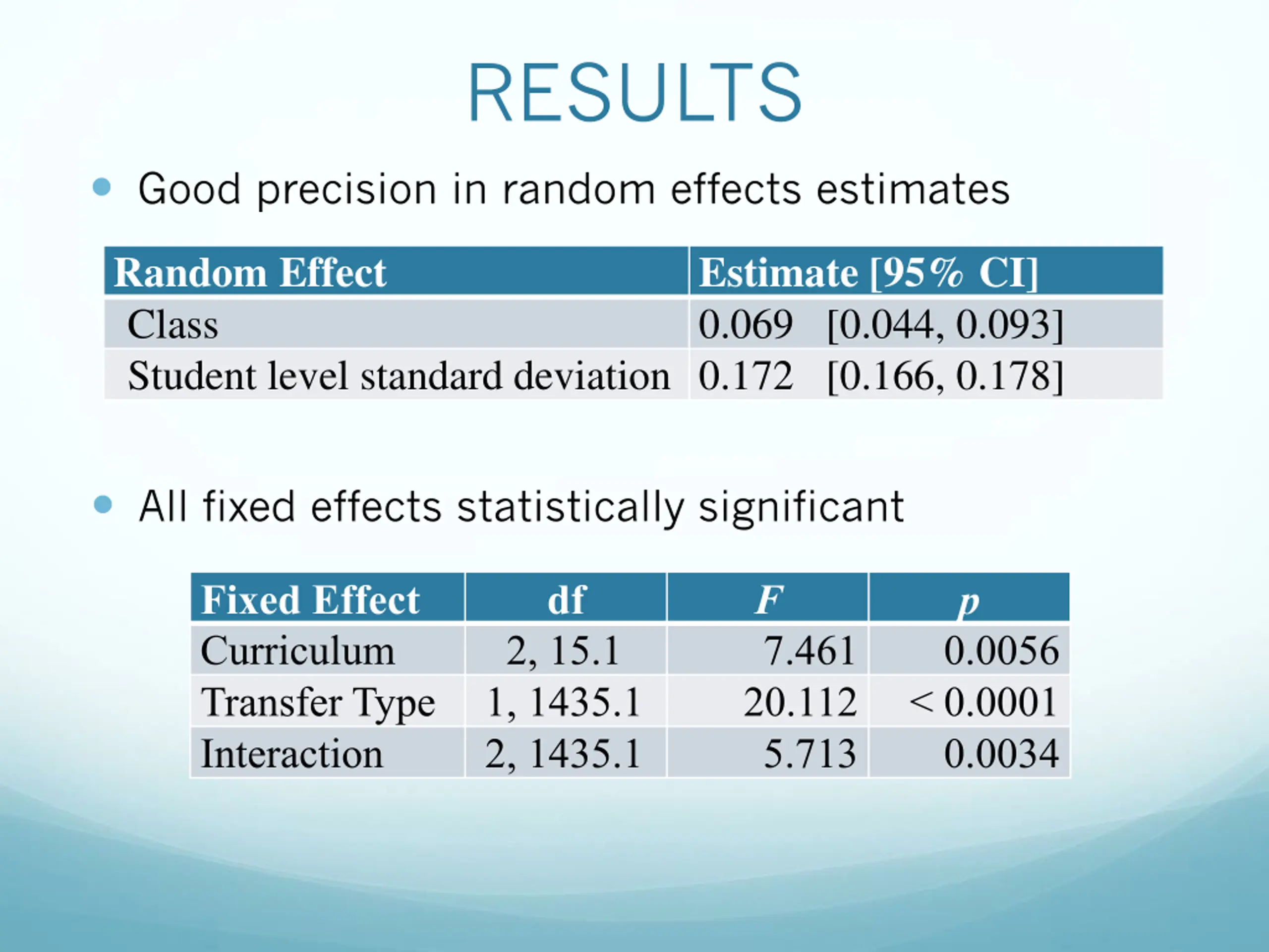 RESULTS Good precision in random effects estimates Random Effect Class Student level standard deviation 0.172 [0.166, 0.178] Estimate [95% CI] 0.069 [0.044, 0.093] All fixed effects statistically significant Fixed Effect Curriculum Transfer Type Interaction df F 7.461 20.112 5.713 p 2, 15.1 1, 1435.1 2, 1435.1 0.0056 < 0.0001 0.0034