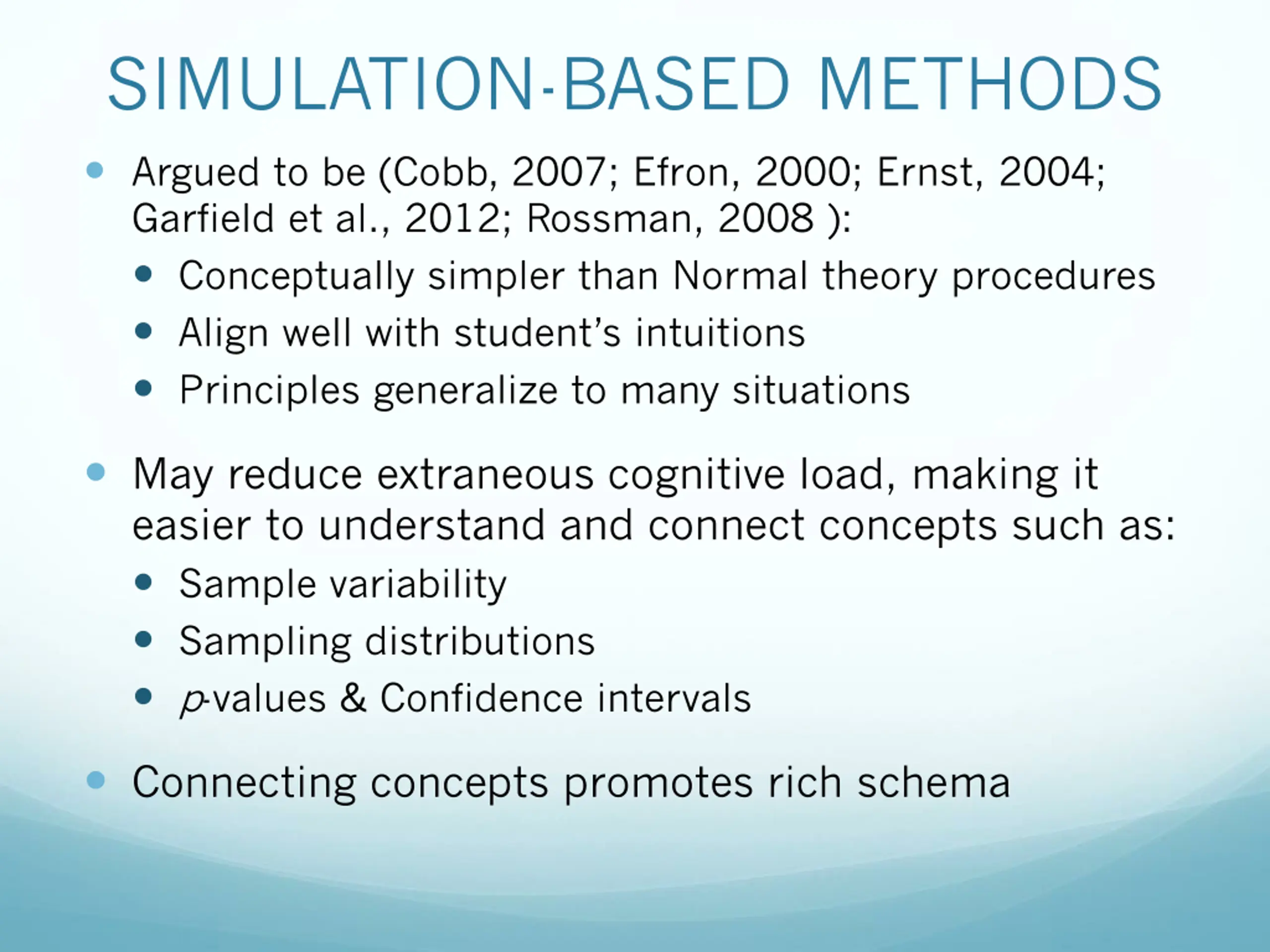SIMULATION-BASED METHODS Argued to be (Cobb, 2007; Efron, 2000; Ernst, 2004; Garfield et al., 2012; Rossman, 2008 ): Conceptually simpler than Normal theory procedures Align well with student s intuitions Principles generalize to many situations May reduce extraneous cognitive load, making it easier to understand and connect concepts such as: Sample variability Sampling distributions p-values & Confidence intervals Connecting concepts promotes rich schema