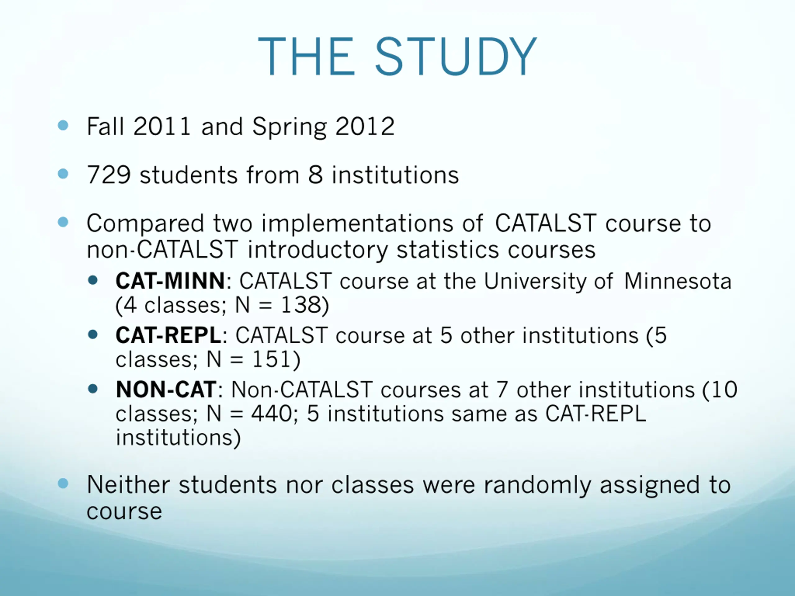 THE STUDY Fall 2011 and Spring 2012 729 students from 8 institutions Compared two implementations of CATALST course to non-CATALST introductory statistics courses CAT-MINN: CATALST course at the University of Minnesota (4 classes; N = 138) CAT-REPL: CATALST course at 5 other institutions (5 classes; N = 151) NON-CAT: Non-CATALST courses at 7 other institutions (10 classes; N = 440; 5 institutions same as CAT-REPL institutions) Neither students nor classes were randomly assigned to course