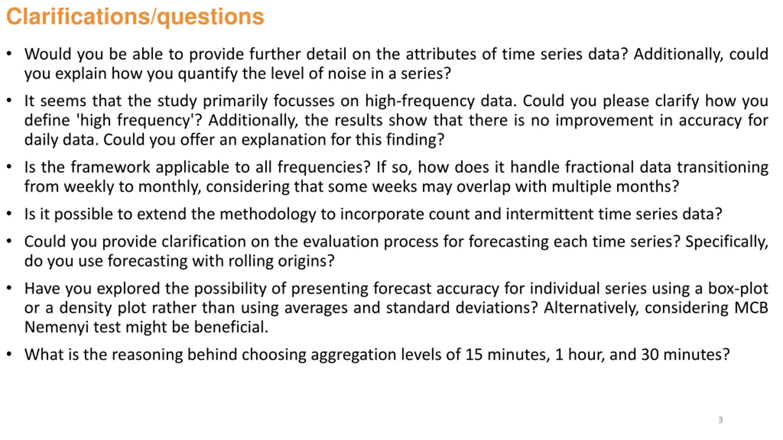 Clarifications/questions Would you be able to provide further detail on the attributes of time series data? Additionally, could you explain how you quantify the level of noise in a series? It seems that the study primarily focusses on high-frequency data. Could you please clarify how you define 'high frequency'? Additionally, the results show that there is no improvement in accuracy for daily data. Could you offer an explanation for this finding? Is the framework applicable to all frequencies? If so, how does it handle fractional data transitioning from weekly to monthly, considering that some weeks may overlap with multiple months? Is it possible to extend the methodology to incorporate count and intermittent time series data? Could you provide clarification on the evaluation process for forecasting each time series? Specifically, do you use forecasting with rolling origins? Have you explored the possibility of presenting forecast accuracy for individual series using a box-plot or a density plot rather than using averages and standard deviations? Alternatively, considering MCB Nemenyi test might be beneficial. What is the reasoning behind choosing aggregation levels of 15 minutes, 1 hour, and 30 minutes? 3
