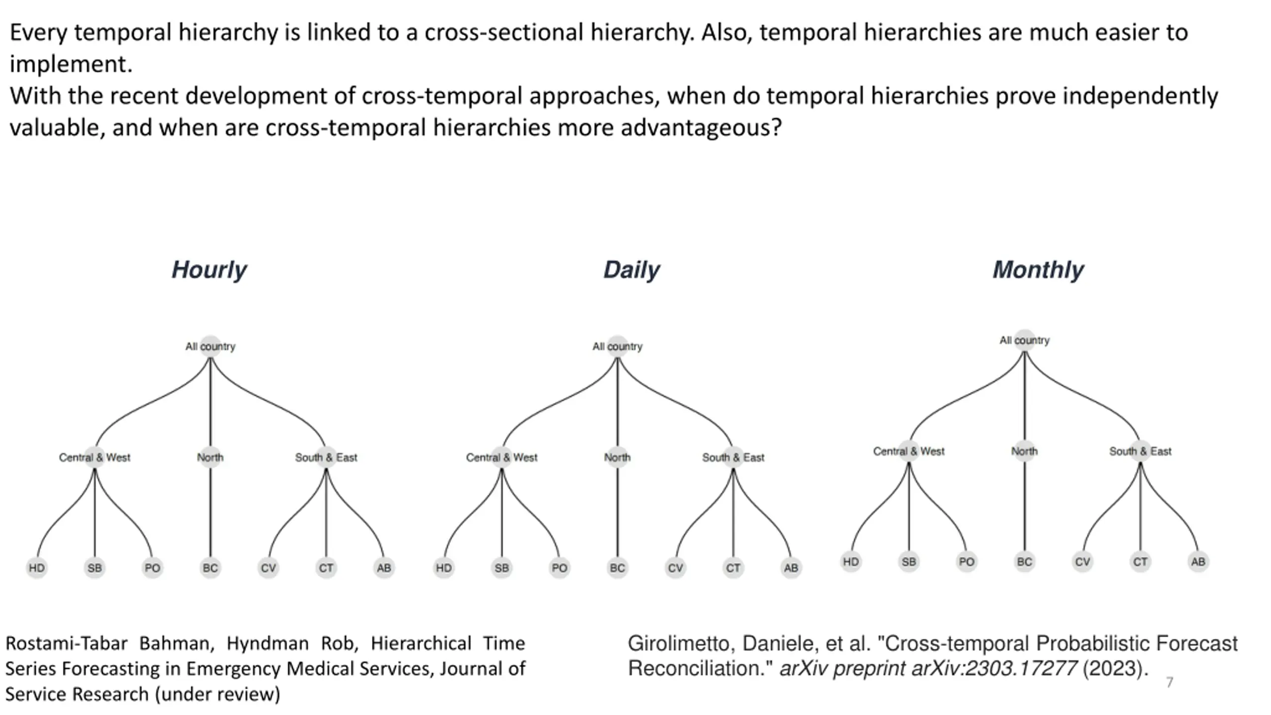Every temporal hierarchy is linked to a cross-sectional hierarchy. Also, temporal hierarchies are much easier to implement. With the recent development of cross-temporal approaches, when do temporal hierarchies prove independently valuable, and when are cross-temporal hierarchies more advantageous? Hourly Daily Monthly Girolimetto, Daniele, et al. "Cross-temporal Probabilistic Forecast Reconciliation." arXiv preprint arXiv:2303.17277 (2023). Rostami-Tabar Bahman, Hyndman Rob, Hierarchical Time Series Forecasting in Emergency Medical Services, Journal of Service Research (under review) 7