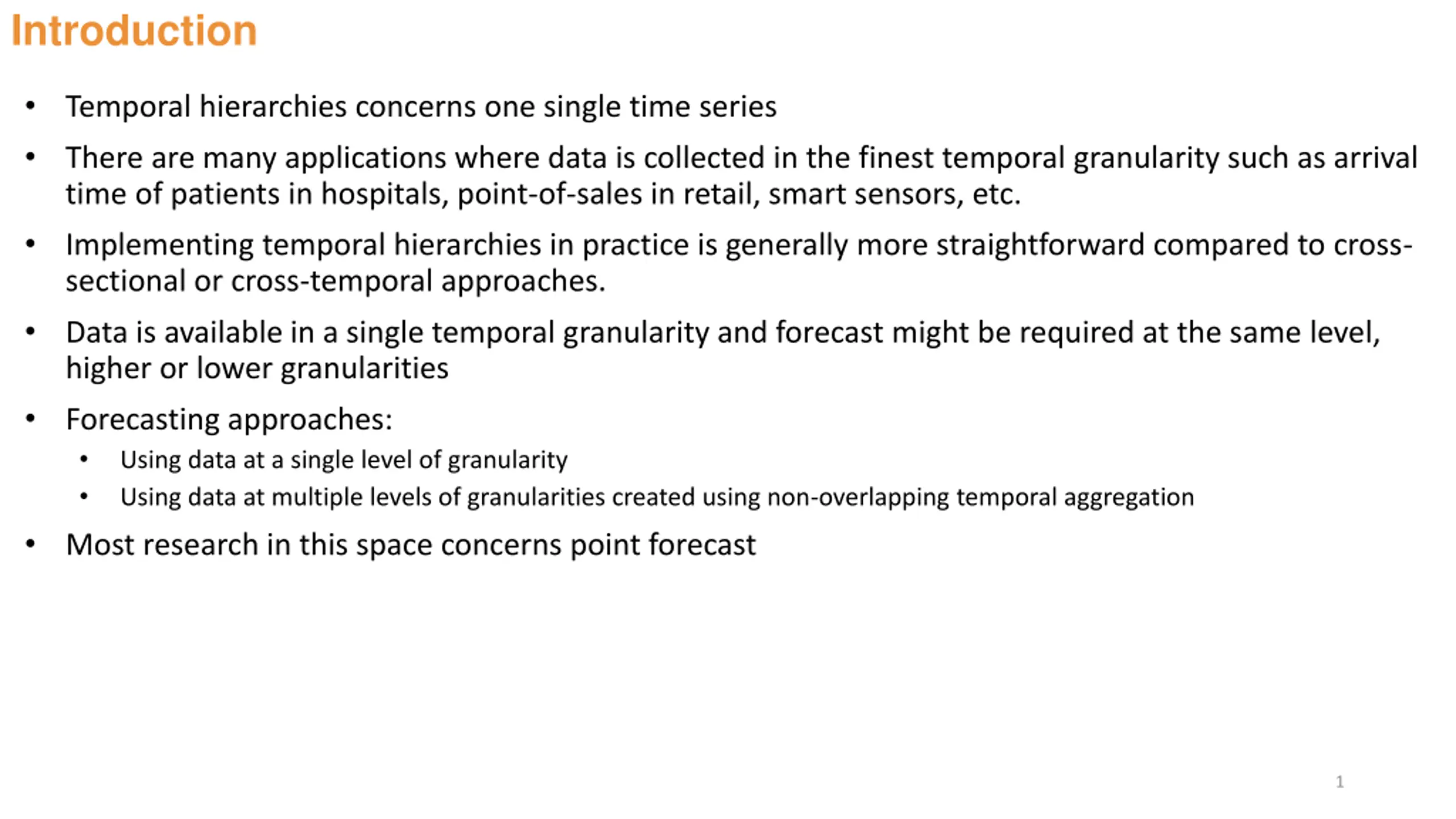 Introduction Temporal hierarchies concerns one single time series There are many applications where data is collected in the finest temporal granularity such as arrival time of patients in hospitals, point-of-sales in retail, smart sensors, etc. Implementing temporal hierarchies in practice is generally more straightforward compared to cross- sectional or cross-temporal approaches. Data is available in a single temporal granularity and forecast might be required at the same level, higher or lower granularities Forecasting approaches: Using data at a single level of granularity Using data at multiple levels of granularities created using non-overlapping temporal aggregation Most research in this space concerns point forecast 1