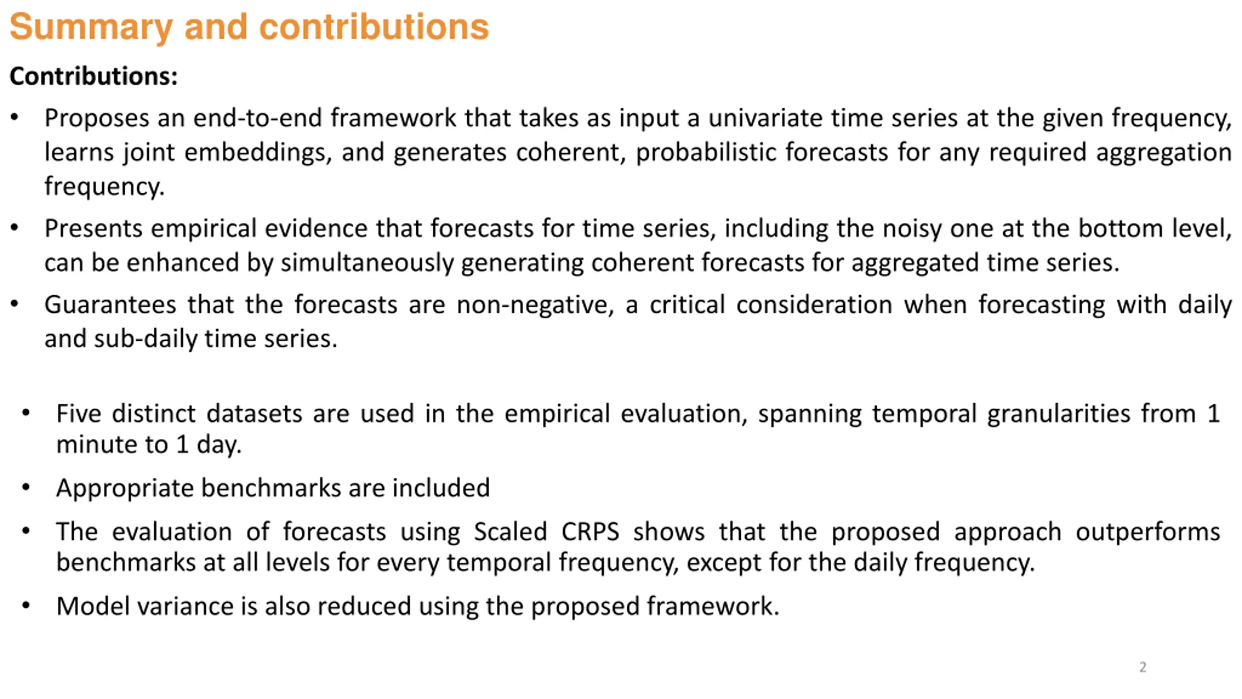 Summary and contributions Contributions: Proposes an end-to-end framework that takes as input a univariate time series at the given frequency, learns joint embeddings, and generates coherent, probabilistic forecasts for any required aggregation frequency. Presents empirical evidence that forecasts for time series, including the noisy one at the bottom level, can be enhanced by simultaneously generating coherent forecasts for aggregated time series. Guarantees that the forecasts are non-negative, a critical consideration when forecasting with daily and sub-daily time series. Five distinct datasets are used in the empirical evaluation, spanning temporal granularities from 1 minute to 1 day. Appropriate benchmarks are included The evaluation of forecasts using Scaled CRPS shows that the proposed approach outperforms benchmarks at all levels for every temporal frequency, except for the daily frequency. Model variance is also reduced using the proposed framework. 2
