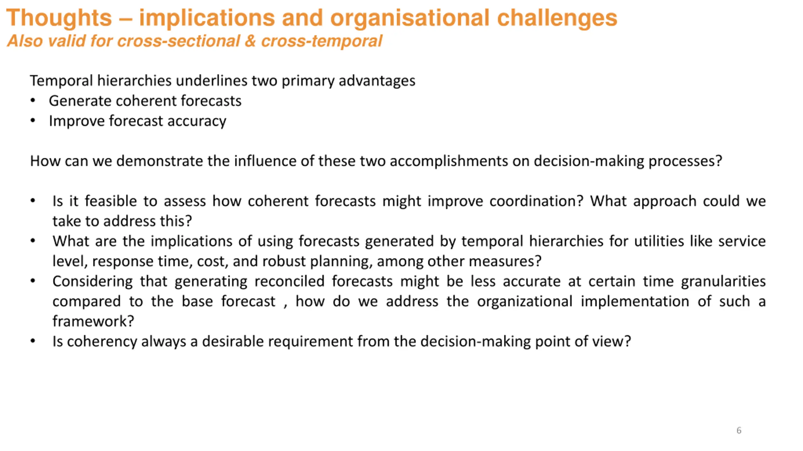 Thoughts implications and organisational challenges Also valid for cross-sectional & cross-temporal Temporal hierarchies underlines two primary advantages Generate coherent forecasts Improve forecast accuracy How can we demonstrate the influence of these two accomplishments on decision-making processes? Is it feasible to assess how coherent forecasts might improve coordination? What approach could we take to address this? What are the implications of using forecasts generated by temporal hierarchies for utilities like service level, response time, cost, and robust planning, among other measures? Considering that generating reconciled forecasts might be less accurate at certain time granularities compared to the base forecast , how do we address the organizational implementation of such a framework? Is coherency always a desirable requirement from the decision-making point of view? 6