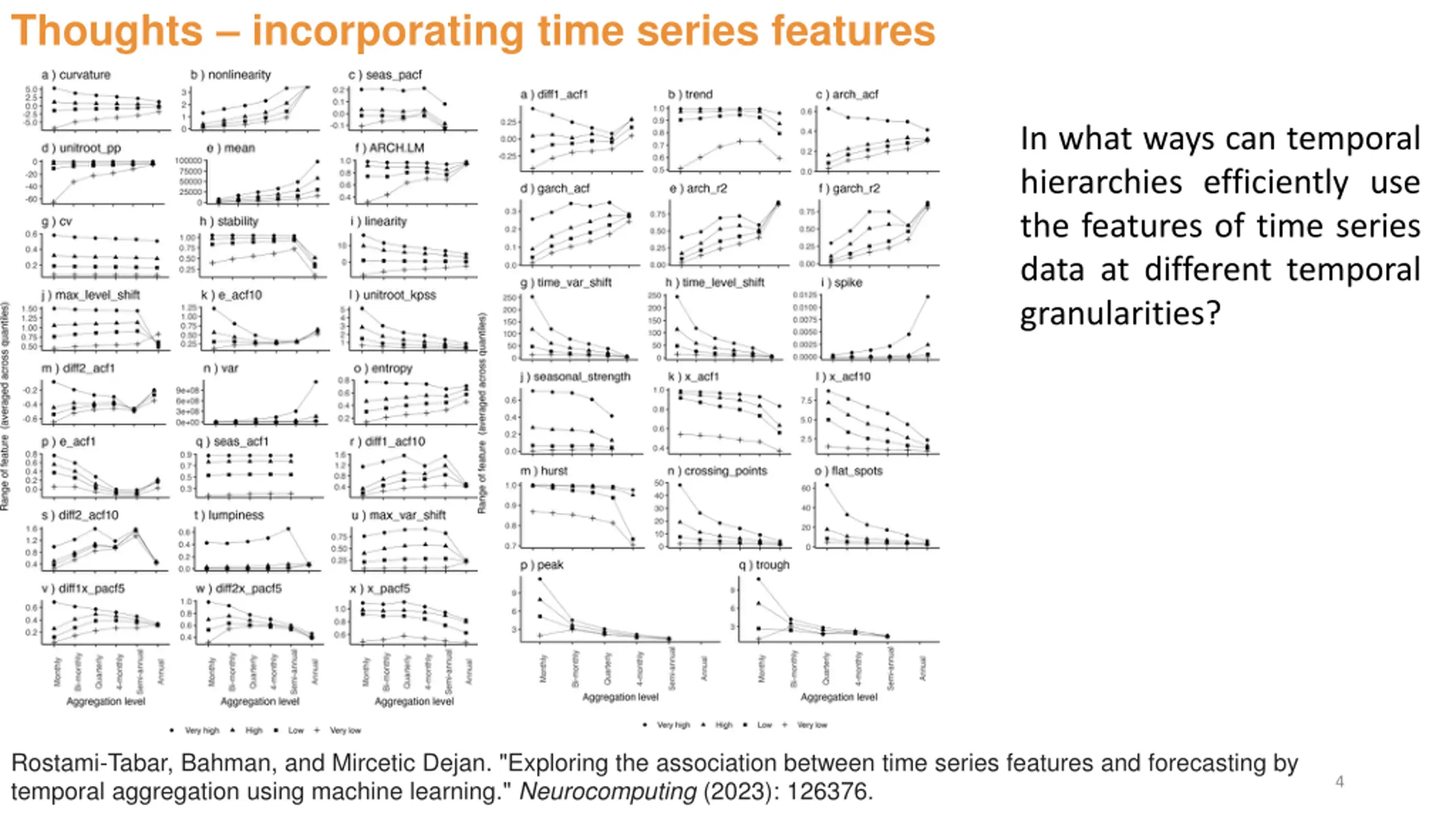 Thoughts incorporating time series features In what ways can temporal hierarchies efficiently use the features of time series data at different temporal granularities? Rostami-Tabar, Bahman, and Mircetic Dejan. "Exploring the association between time series features and forecasting by temporal aggregation using machine learning." Neurocomputing (2023): 126376. 4