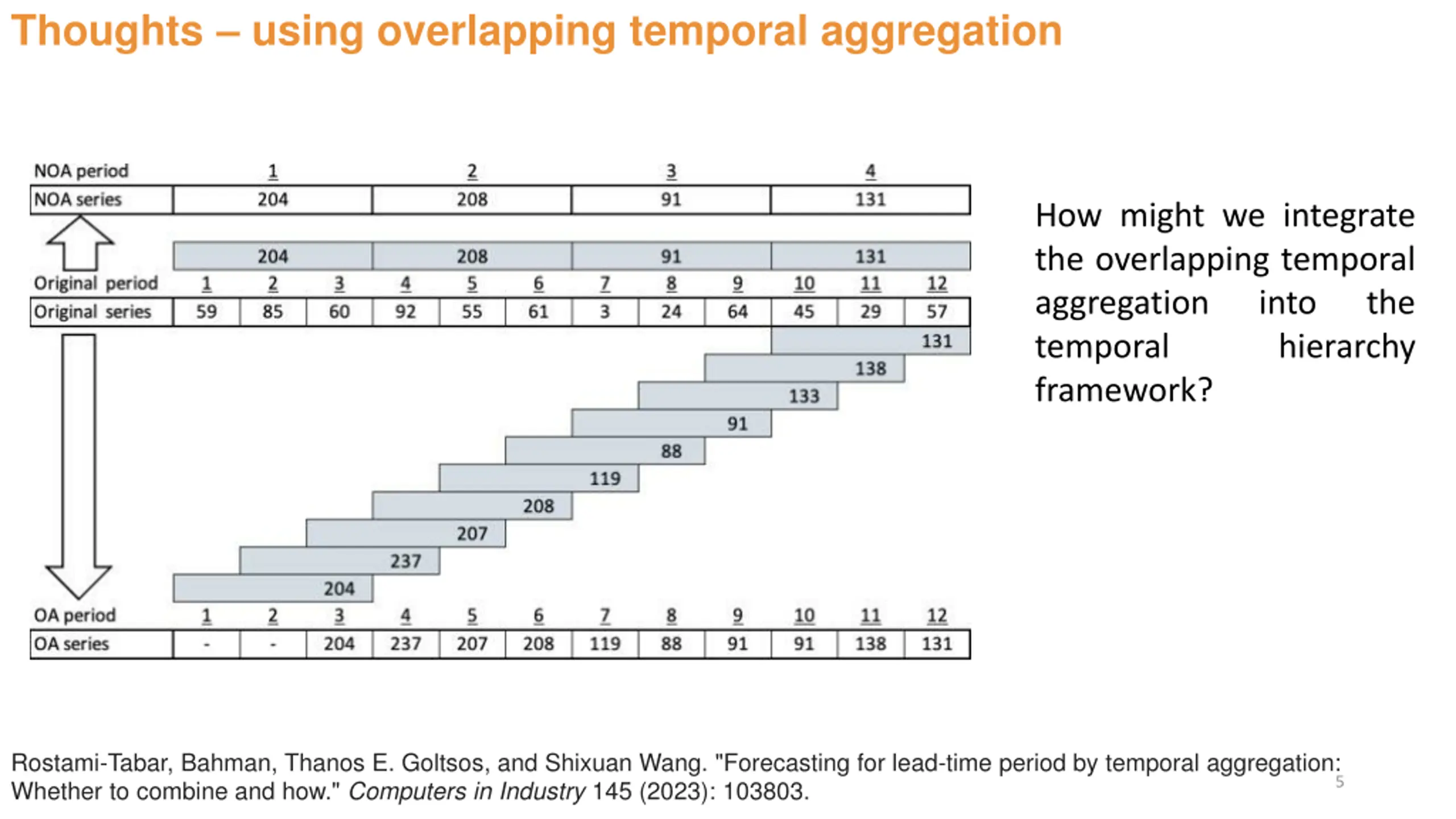 Thoughts using overlapping temporal aggregation How might we integrate the overlapping temporal aggregation temporal framework? into hierarchy the Rostami-Tabar, Bahman, Thanos E. Goltsos, and Shixuan Wang. "Forecasting for lead-time period by temporal aggregation: Whether to combine and how." Computers in Industry 145 (2023): 103803. 5