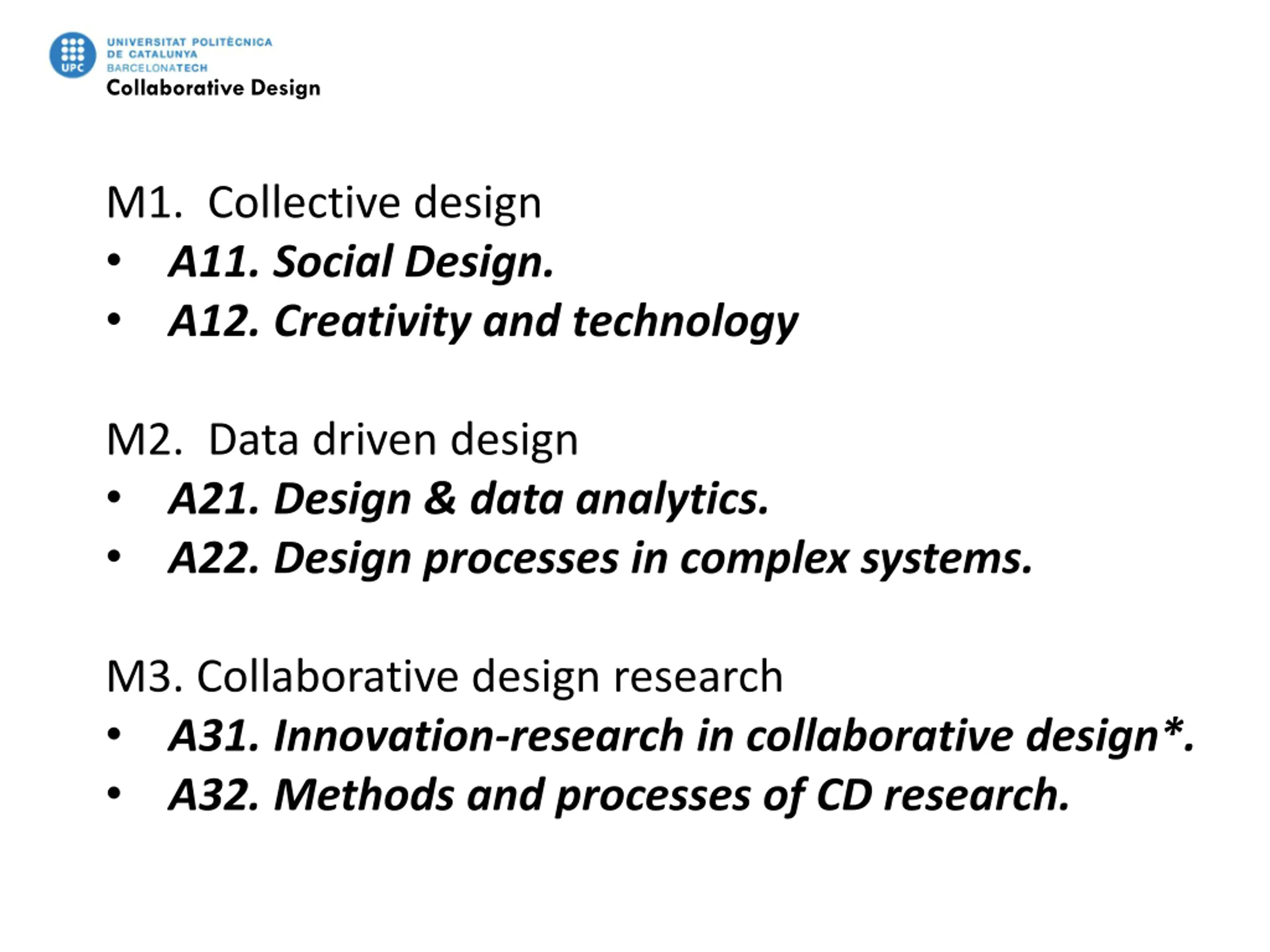 Collaborative Design M1. Collective design A11. Social Design. A12. Creativity and technology M2. Data driven design A21. Design & data analytics. A22. Design processes in complex systems. M3. Collaborative design research A31. Innovation-research in collaborative design*. A32. Methods and processes of CD research.