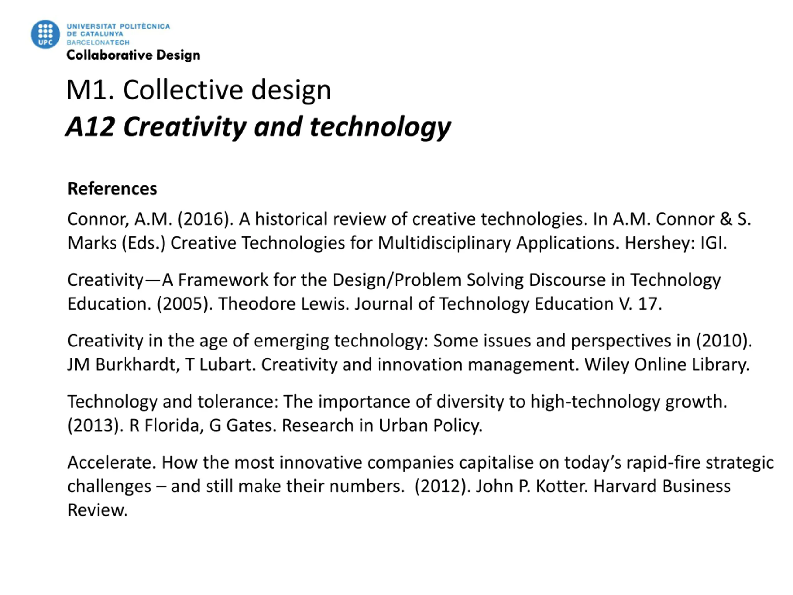 Collaborative Design Collaborative Design M1. Collective design A12 Creativity and technology References Connor, A.M. (2016). A historical review of creative technologies. In A.M. Connor & S. Marks (Eds.) Creative Technologies for Multidisciplinary Applications. Hershey: IGI. Creativity A Framework for the Design/Problem Solving Discourse in Technology Education. (2005). Theodore Lewis. Journal of Technology Education V. 17. Creativity in the age of emerging technology: Some issues and perspectives in (2010). JM Burkhardt, T Lubart. Creativity and innovation management. Wiley Online Library. Technology and tolerance: The importance of diversity to high-technology growth. (2013). R Florida, G Gates. Research in Urban Policy. Accelerate. How the most innovative companies capitalise on today s rapid-fire strategic challenges and still make their numbers. (2012). John P. Kotter. Harvard Business Review.