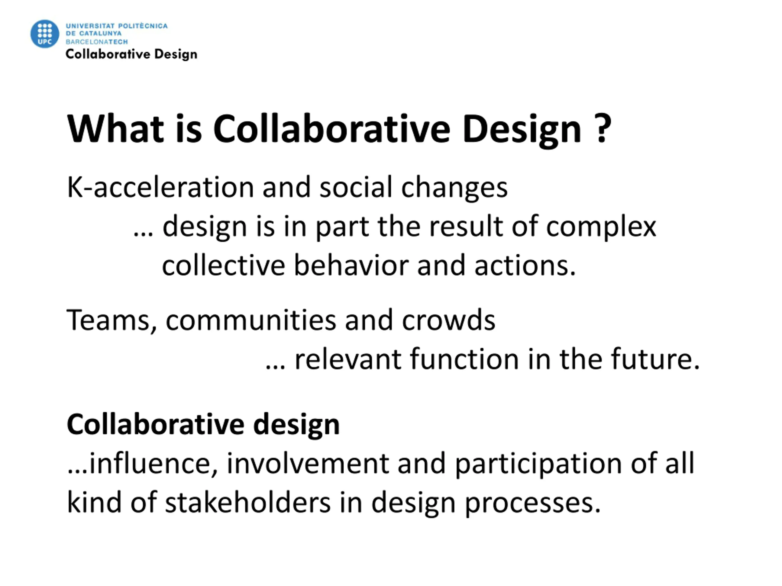Collaborative Design What is Collaborative Design ? K-acceleration and social changes design is in part the result of complex collective behavior and actions. Teams, communities and crowds relevant function in the future. Collaborative design influence, involvement and participation of all kind of stakeholders in design processes.
