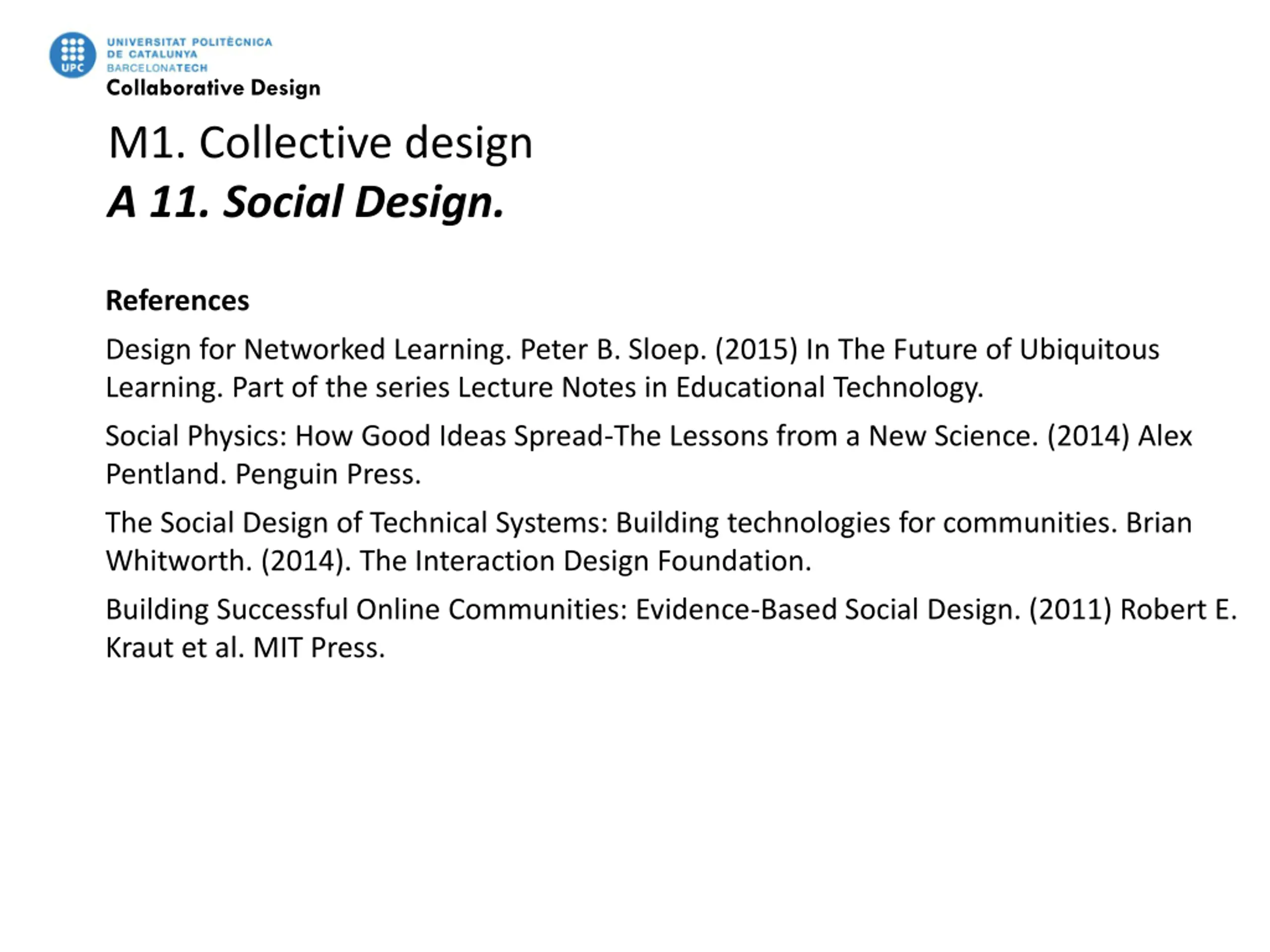 Collaborative Design M1. Collective design A 11. Social Design. References Design for Networked Learning. Peter B. Sloep. (2015) In The Future of Ubiquitous Learning. Part of the series Lecture Notes in Educational Technology. Social Physics: How Good Ideas Spread-The Lessons from a New Science. (2014) Alex Pentland. Penguin Press. The Social Design of Technical Systems: Building technologies for communities. Brian Whitworth. (2014). The Interaction Design Foundation. Building Successful Online Communities: Evidence-Based Social Design. (2011) Robert E. Kraut et al. MIT Press.