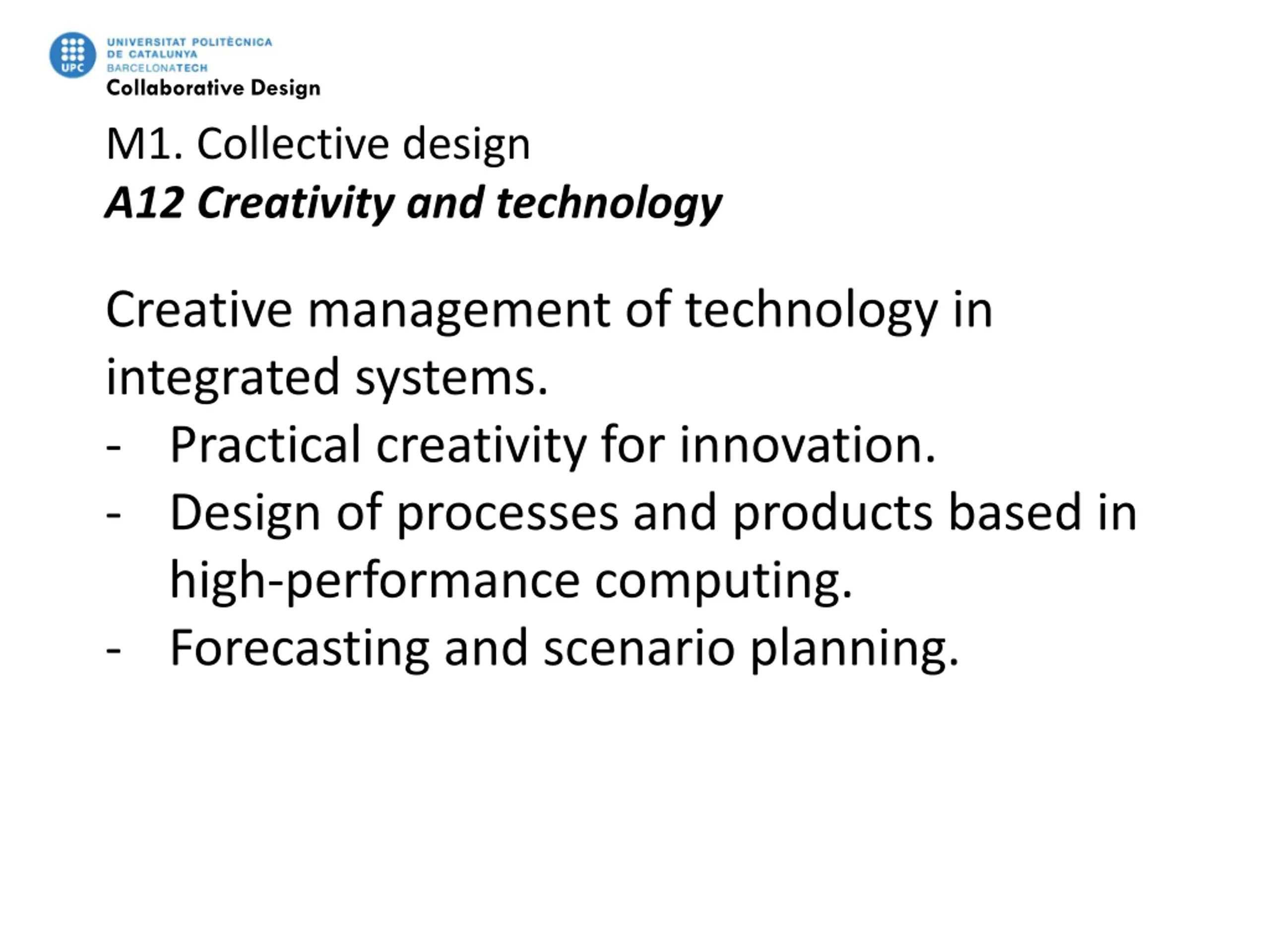 Collaborative Design M1. Collective design A12 Creativity and technology Creative management of technology in integrated systems. - Practical creativity for innovation. - Design of processes and products based in high-performance computing. - Forecasting and scenario planning.