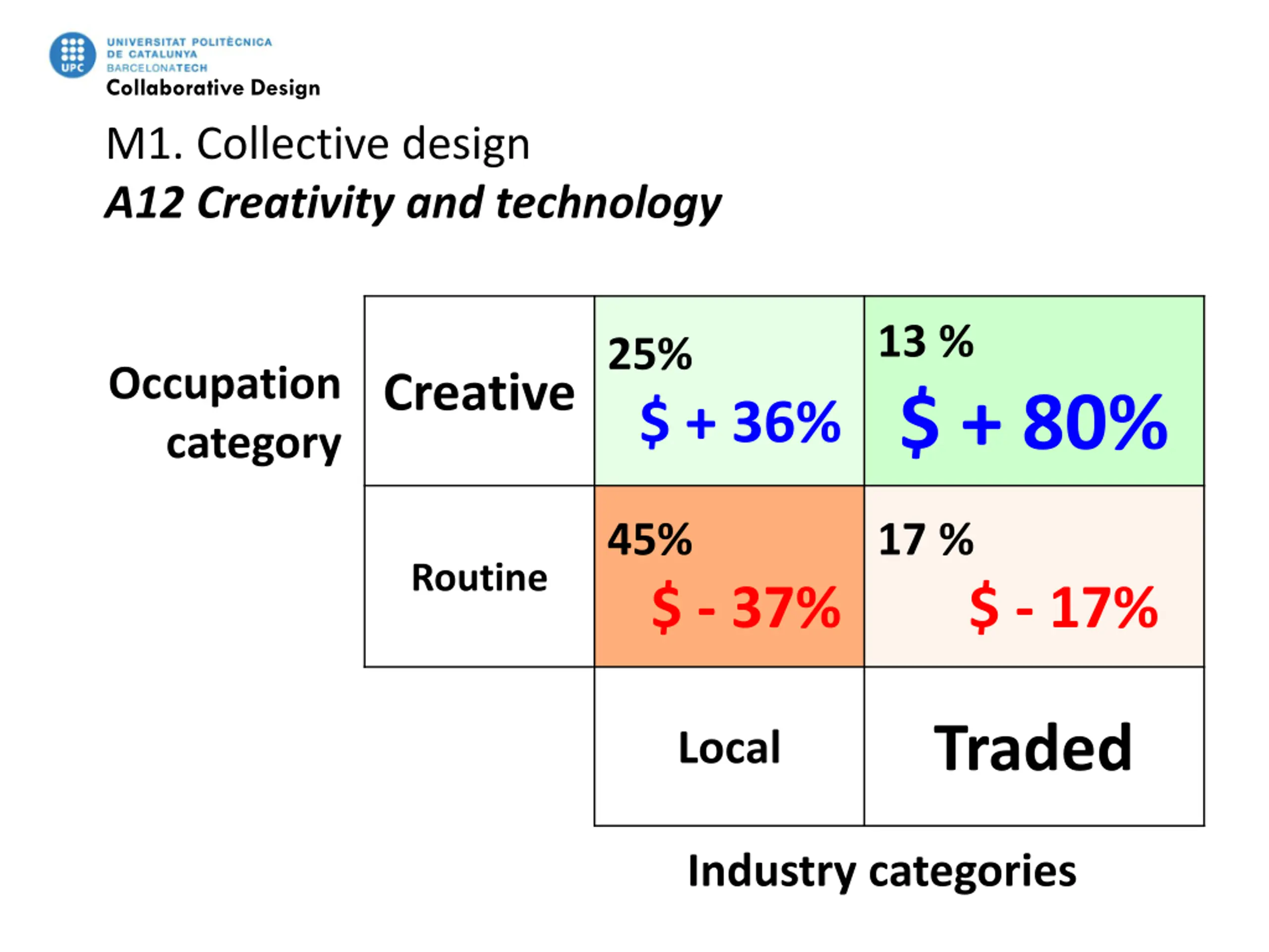 Collaborative Design M1. Collective design A12 Creativity and technology 13 % $ + 80% 25% $ + 36% Occupation category Creative 45% $ - 37% 17 % $ - 17% Routine Traded Local Industry categories