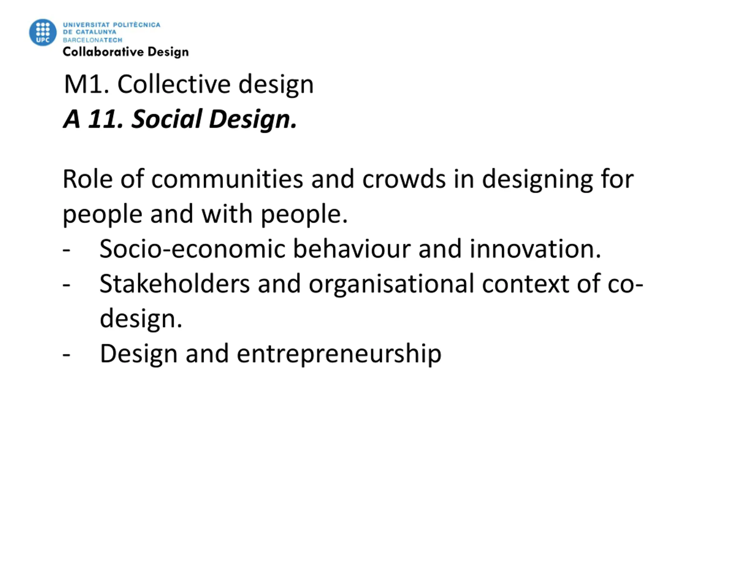 Collaborative Design M1. Collective design A 11. Social Design. Role of communities and crowds in designing for people and with people. - Socio-economic behaviour and innovation. - Stakeholders and organisational context of co- design. - Design and entrepreneurship