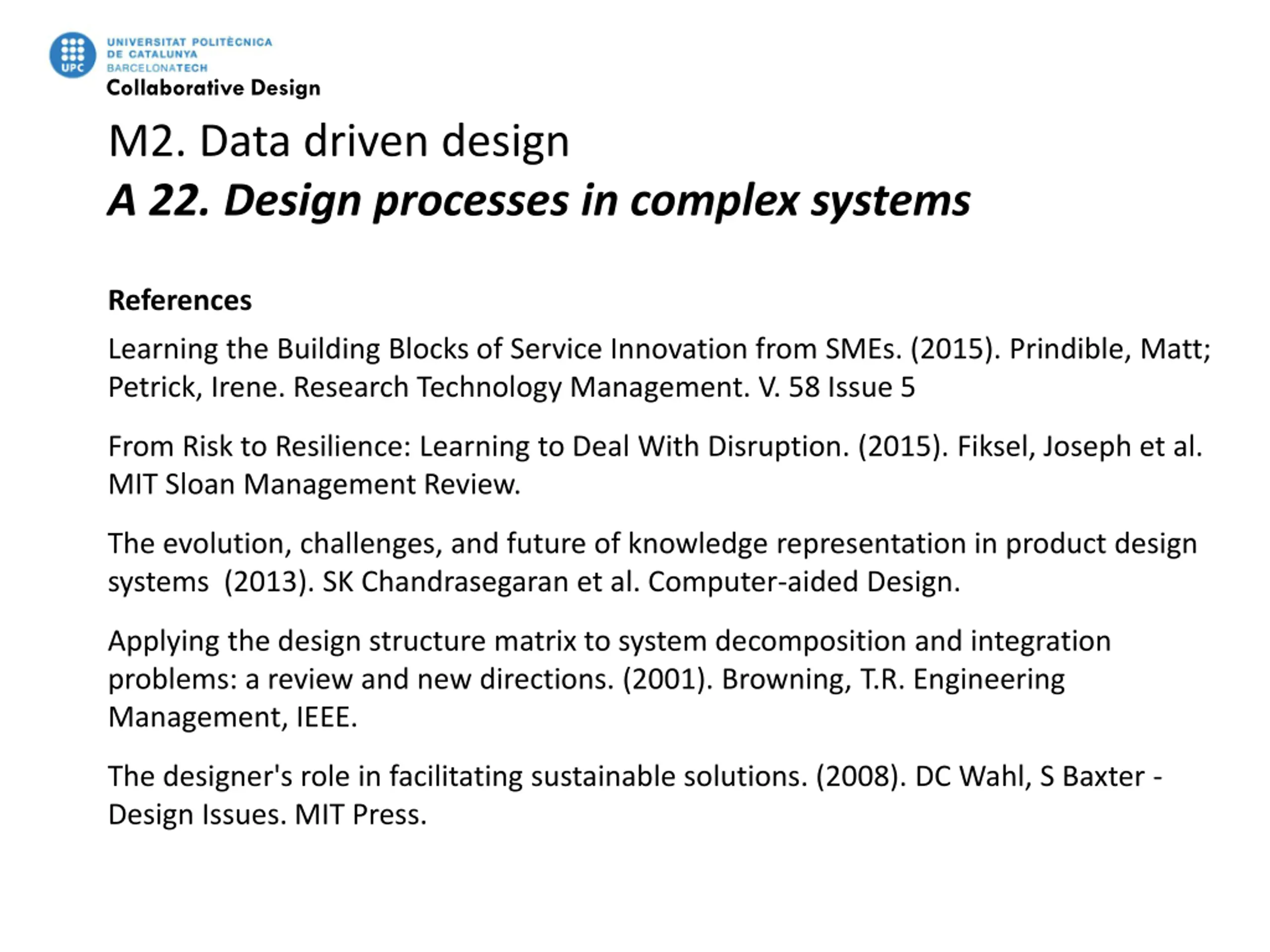 Collaborative Design M2. Data driven design A 22. Design processes in complex systems References Learning the Building Blocks of Service Innovation from SMEs. (2015). Prindible, Matt; Petrick, Irene. Research Technology Management. V. 58 Issue 5 From Risk to Resilience: Learning to Deal With Disruption. (2015). Fiksel, Joseph et al. MIT Sloan Management Review. The evolution, challenges, and future of knowledge representation in product design systems (2013). SK Chandrasegaran et al. Computer-aided Design. Applying the design structure matrix to system decomposition and integration problems: a review and new directions. (2001). Browning, T.R. Engineering Management, IEEE. The designer's role in facilitating sustainable solutions. (2008). DC Wahl, S Baxter - Design Issues. MIT Press.
