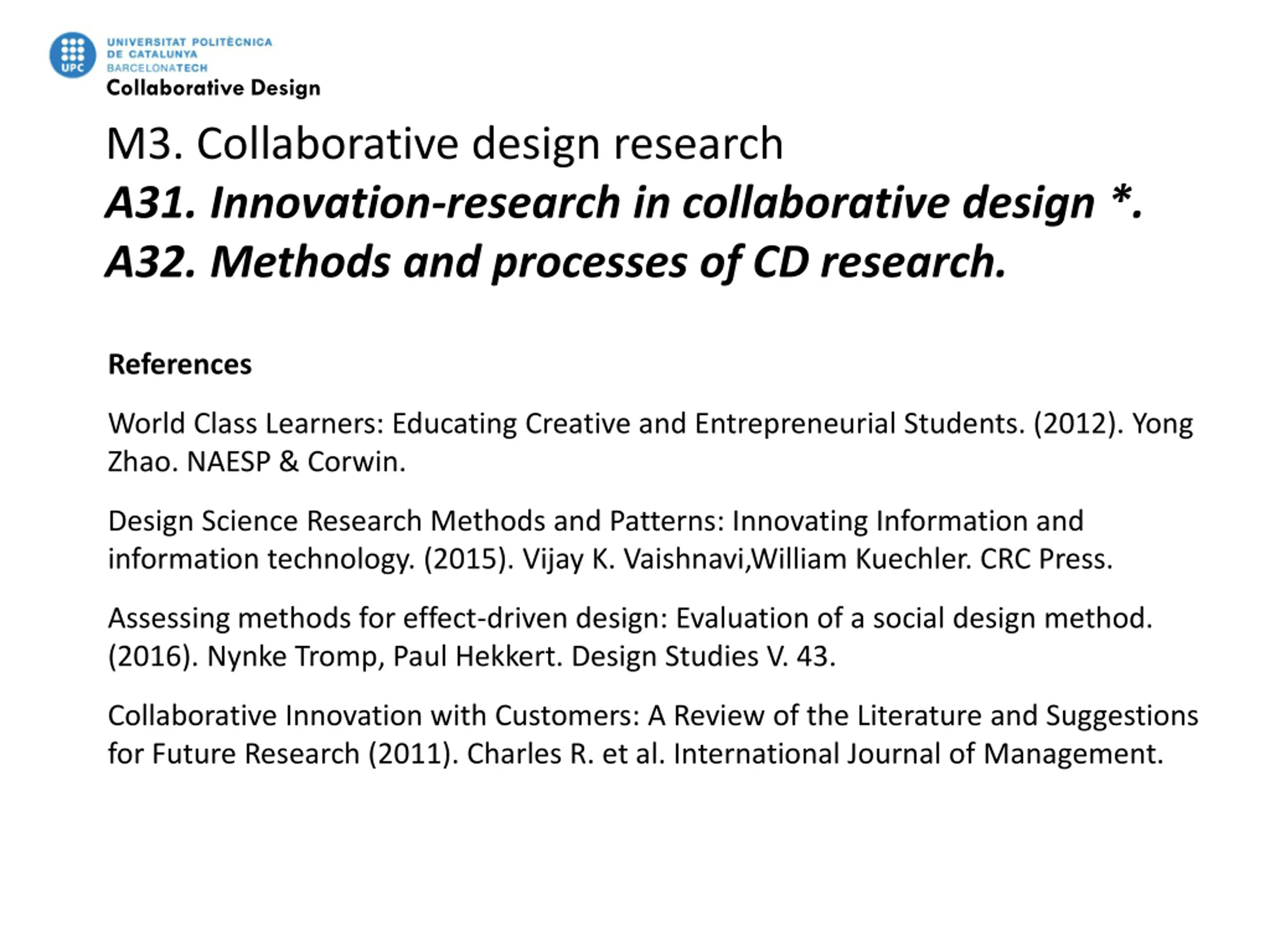 Collaborative Design M3. Collaborative design research A31. Innovation-research in collaborative design *. A32. Methods and processes of CD research. References World Class Learners: Educating Creative and Entrepreneurial Students. (2012). Yong Zhao. NAESP & Corwin. Design Science Research Methods and Patterns: Innovating Information and information technology. (2015). Vijay K. Vaishnavi,William Kuechler. CRC Press. Assessing methods for effect-driven design: Evaluation of a social design method. (2016). Nynke Tromp, Paul Hekkert. Design Studies V. 43. Collaborative Innovation with Customers: A Review of the Literature and Suggestions for Future Research (2011). Charles R. et al. International Journal of Management.