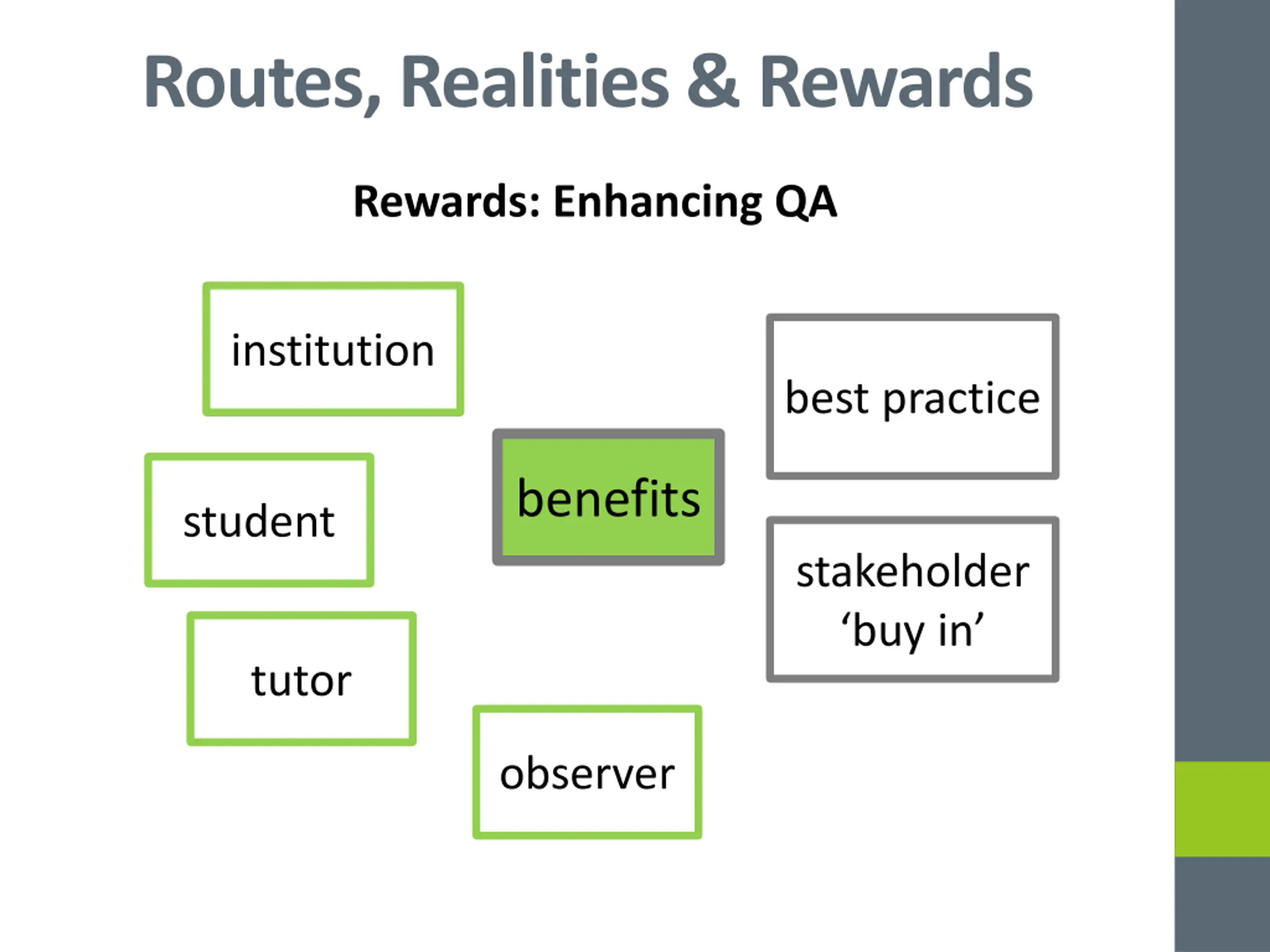 Routes, Realities & Rewards Rewards: Enhancing QA institution best practice benefits student stakeholder buy in tutor observer