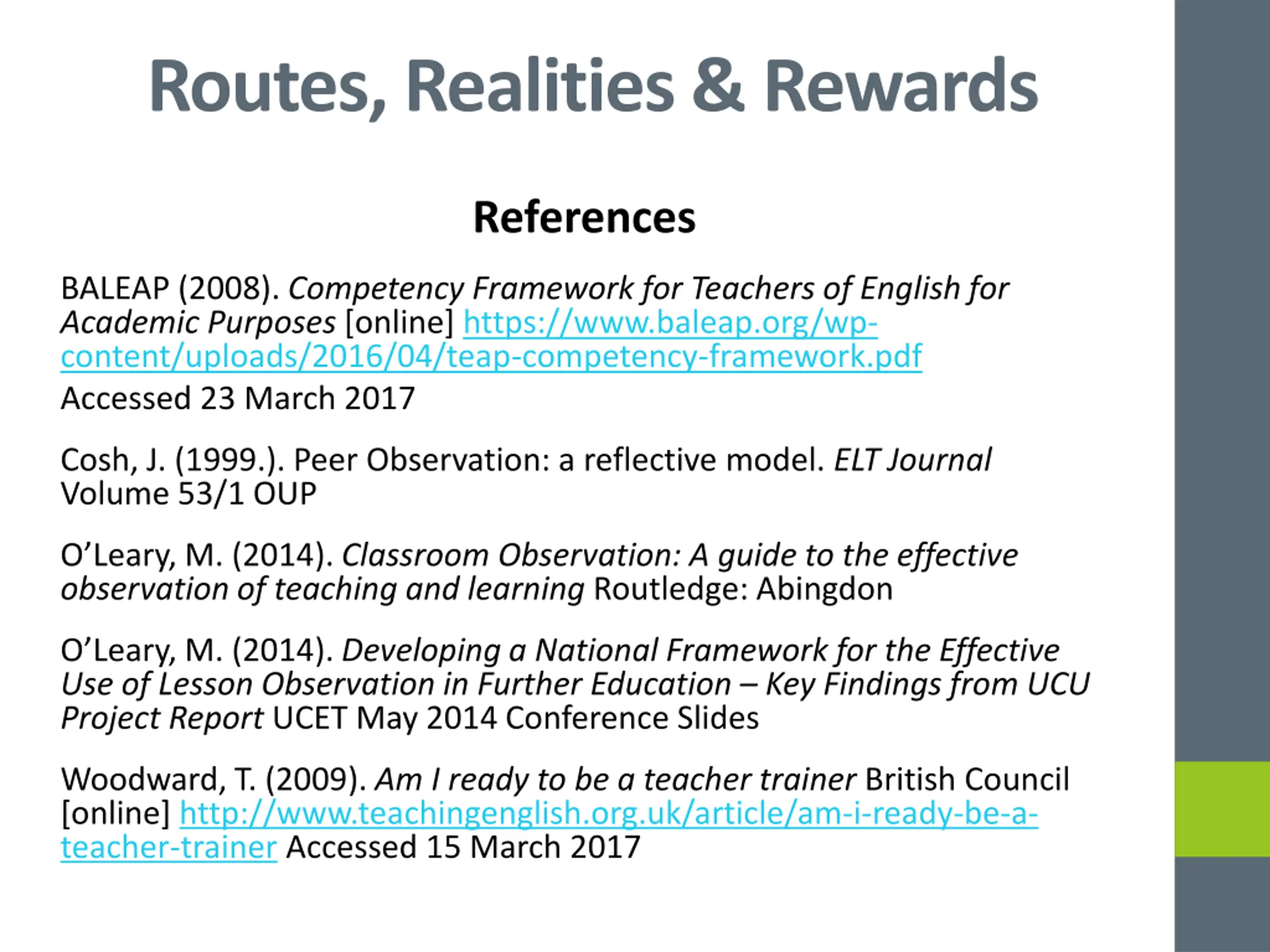 Routes, Realities & Rewards References BALEAP (2008). Competency Framework for Teachers of English for Academic Purposes [online] https://www.baleap.org/wp- content/uploads/2016/04/teap-competency-framework.pdf Accessed 23 March 2017 Cosh, J. (1999.). Peer Observation: a reflective model. ELT Journal Volume 53/1 OUP O Leary, M. (2014). Classroom Observation: A guide to the effective observation of teaching and learning Routledge: Abingdon O Leary, M. (2014). Developing a National Framework for the Effective Use of Lesson Observation in Further Education Key Findings from UCU Project Report UCET May 2014 Conference Slides Woodward, T. (2009). Am I ready to be a teacher trainer British Council [online] http://www.teachingenglish.org.uk/article/am-i-ready-be-a- teacher-trainer Accessed 15 March 2017