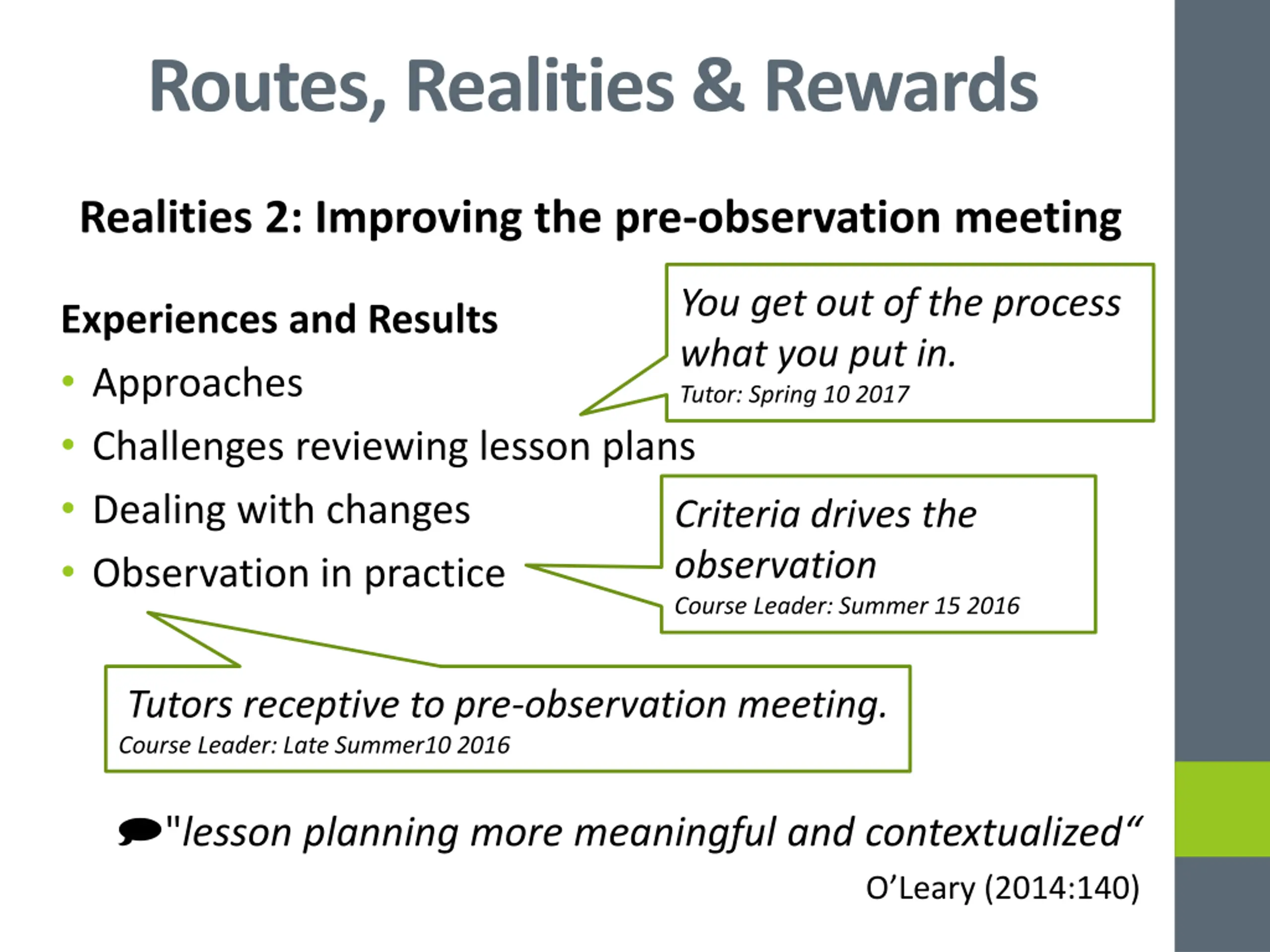 Routes, Realities & Rewards Realities 2: Improving the pre-observation meeting You get out of the process what you put in. Tutor: Spring 10 2017 Experiences and Results Approaches Challenges reviewing lesson plans Dealing with changes Observation in practice Criteria drives the observation Course Leader: Summer 15 2016 Tutors receptive to pre-observation meeting. Course Leader: Late Summer10 2016 "lesson planning more meaningful and contextualized O Leary (2014:140)