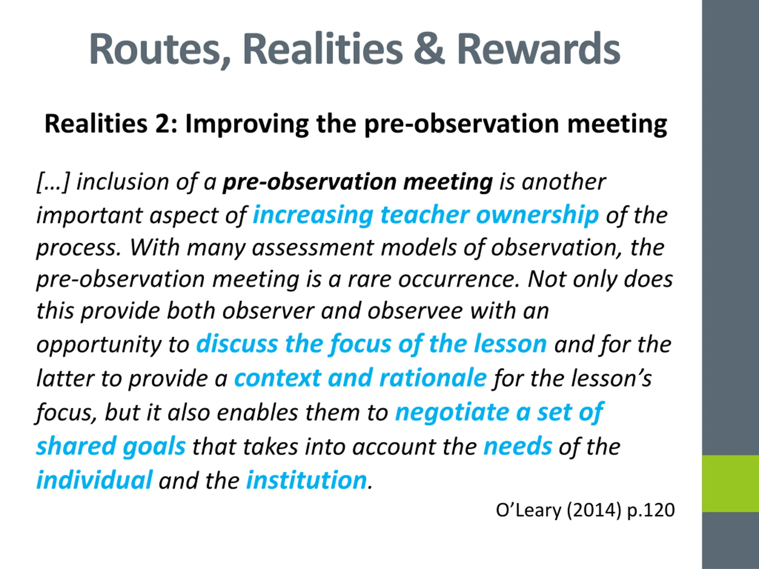 Routes, Realities & Rewards Realities 2: Improving the pre-observation meeting [ ] inclusion of a pre-observation meeting is another important aspect of increasing teacher ownership of the process. With many assessment models of observation, the pre-observation meeting is a rare occurrence. Not only does this provide both observer and observee with an opportunity to discuss the focus of the lesson and for the latter to provide a context and rationale for the lesson s focus, but it also enables them to negotiate a set of shared goals that takes into account the needs of the individual and the institution. O Leary (2014) p.120
