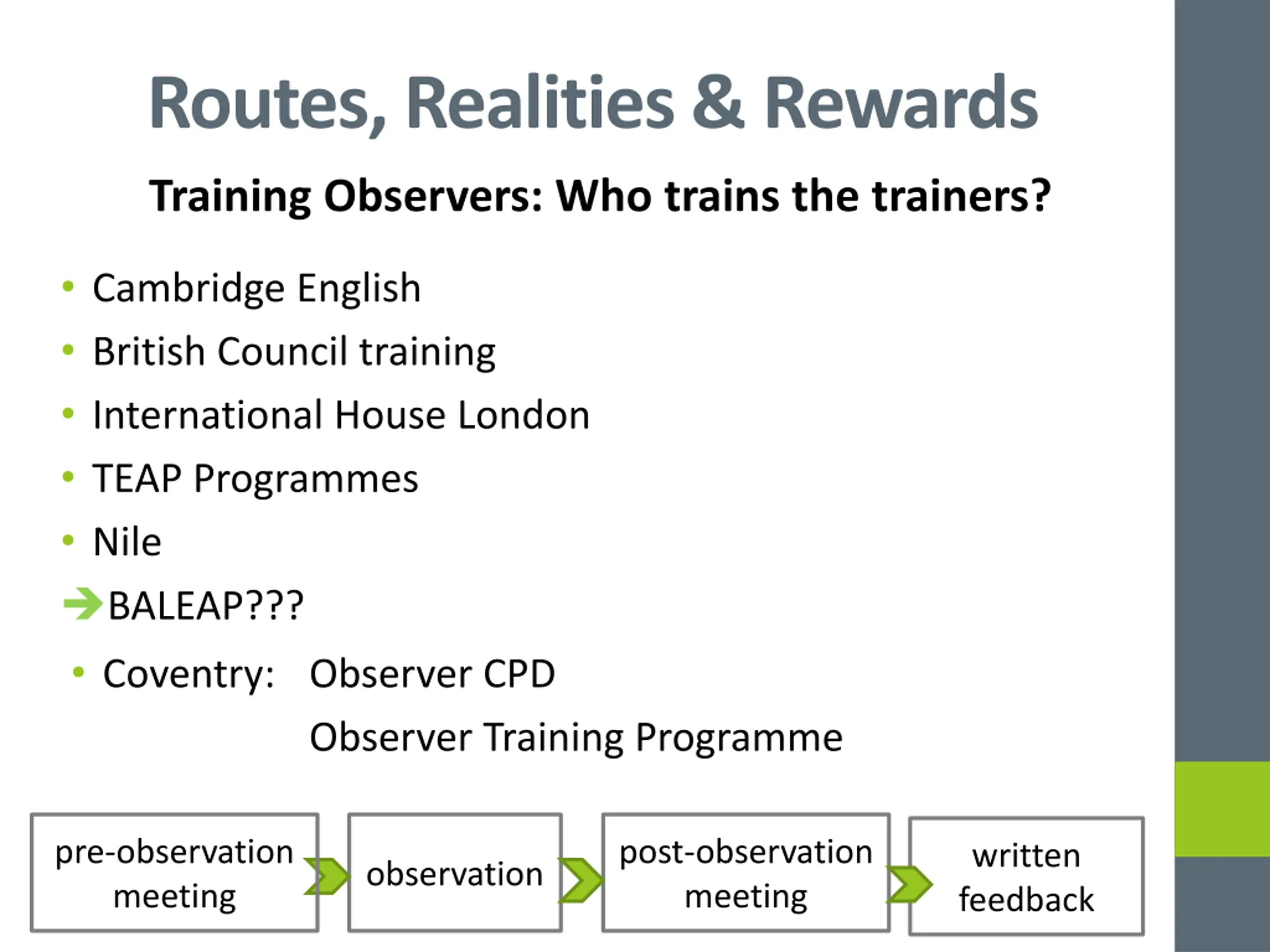 Routes, Realities & Rewards Training Observers: Who trains the trainers? Cambridge English British Council training International House London TEAP Programmes Nile BALEAP??? Coventry: Observer CPD Observer Training Programme pre-observation meeting post-observation meeting written feedback observation