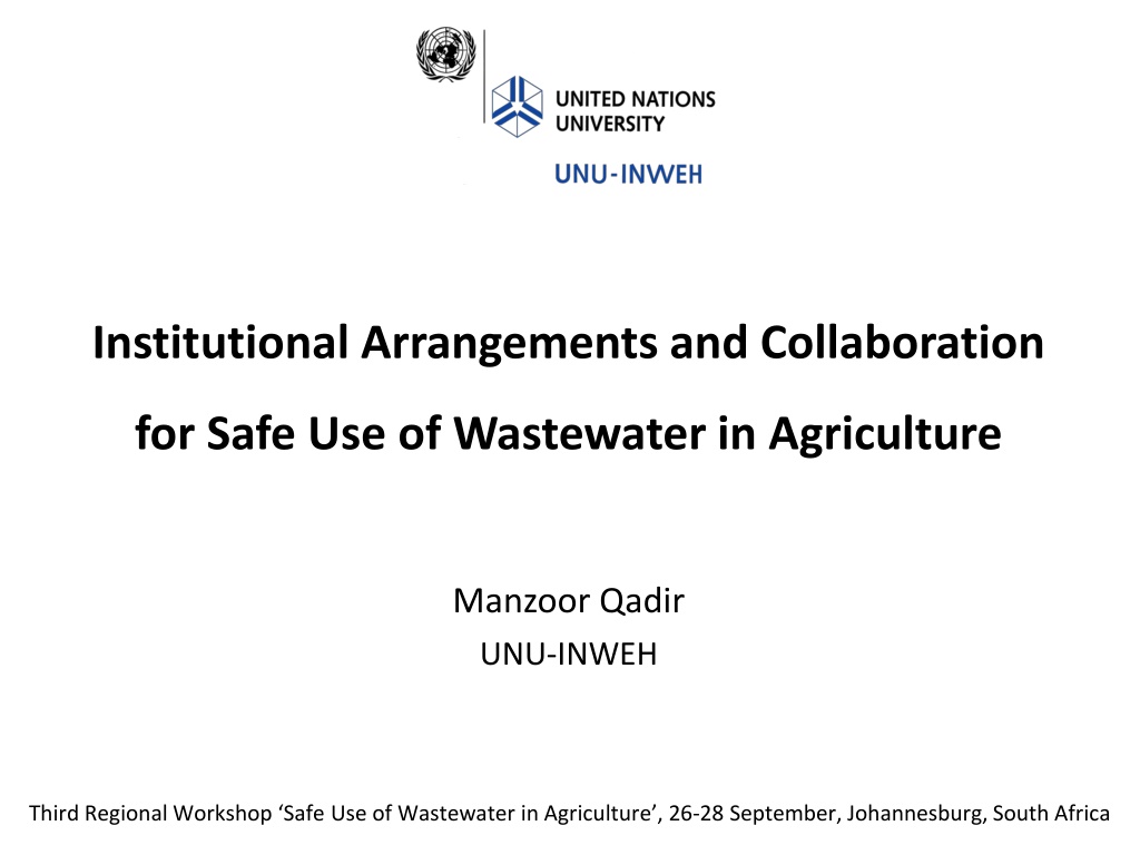 Institutional Arrangements and Collaboration for Safe Use of Wastewater in Agriculture Manzoor Qadir UNU-INWEH Third Regional Workshop Safe Use of Wastewater in Agriculture , 26-28 September, Johannesburg, South Africa