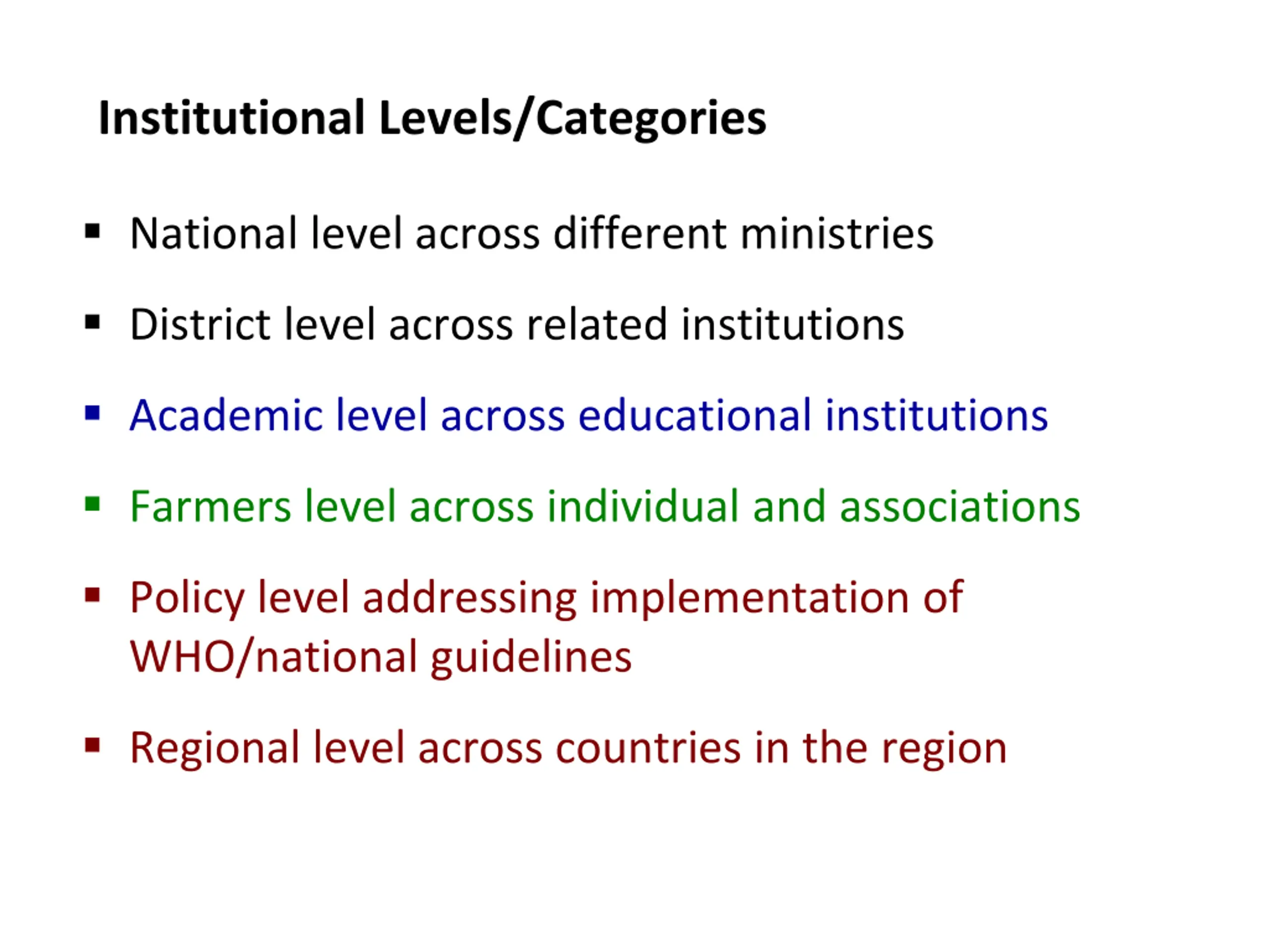 Institutional Levels/Categories National level across different ministries District level across related institutions Academic level across educational institutions Farmers level across individual and associations Policy level addressing implementation of WHO/national guidelines Regional level across countries in the region