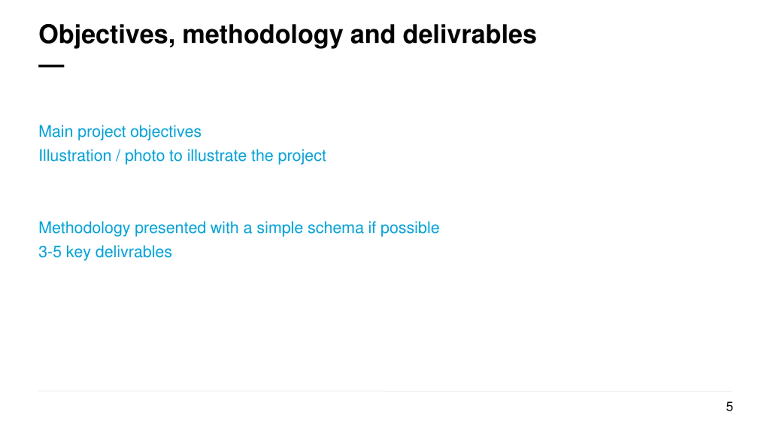 Objectives, methodology and delivrables Main project objectives Illustration / photo to illustrate the project Methodology presented with a simple schema if possible 3-5 key delivrables 5