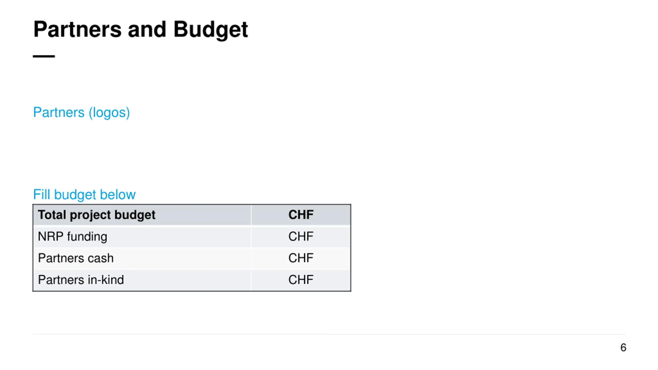 Partners and Budget Partners (logos) Fill budget below Total project budget CHF NRP funding CHF Partners cash CHF Partners in-kind CHF 6