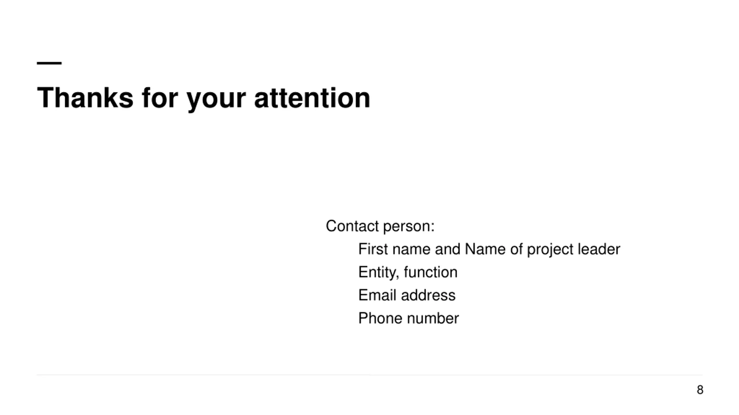 Thanks for your attention Contact person: First name and Name of project leader Entity, function Email address Phone number 8