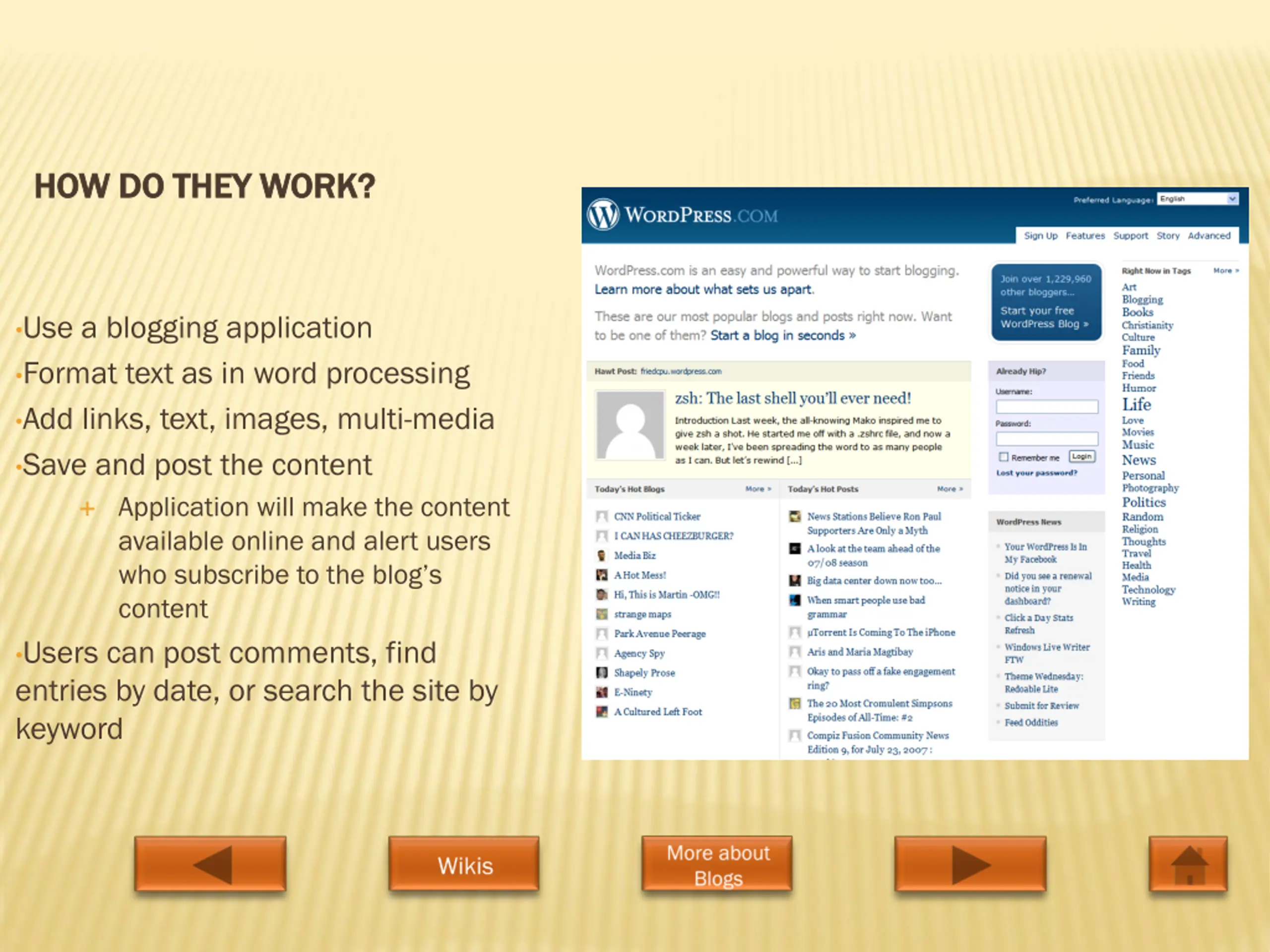 HOW DO THEY WORK? HOW DO THEY WORK? Use a blogging application Format text as in word processing Add links, text, images, multi-media Save and post the content Application will make the content available online and alert users who subscribe to the blog s content Users can post comments, find entries by date, or search the site by keyword More about Blogs Wikis