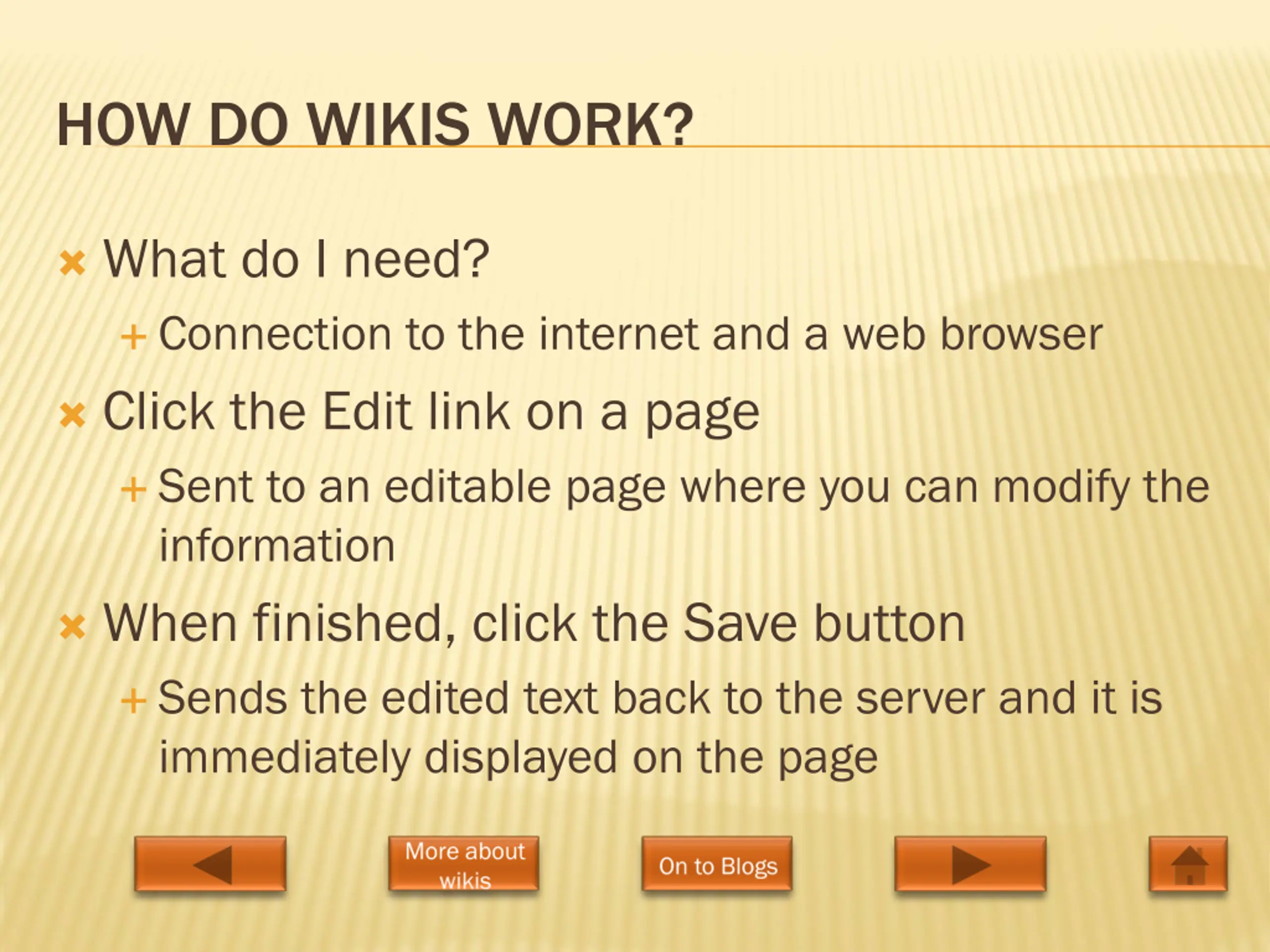 HOW DO WIKIS WORK? What do I need? Connection to the internet and a web browser Click the Edit link on a page Sent to an editable page where you can modify the information When finished, click the Save button Sends the edited text back to the server and it is immediately displayed on the page More about wikis On to Blogs