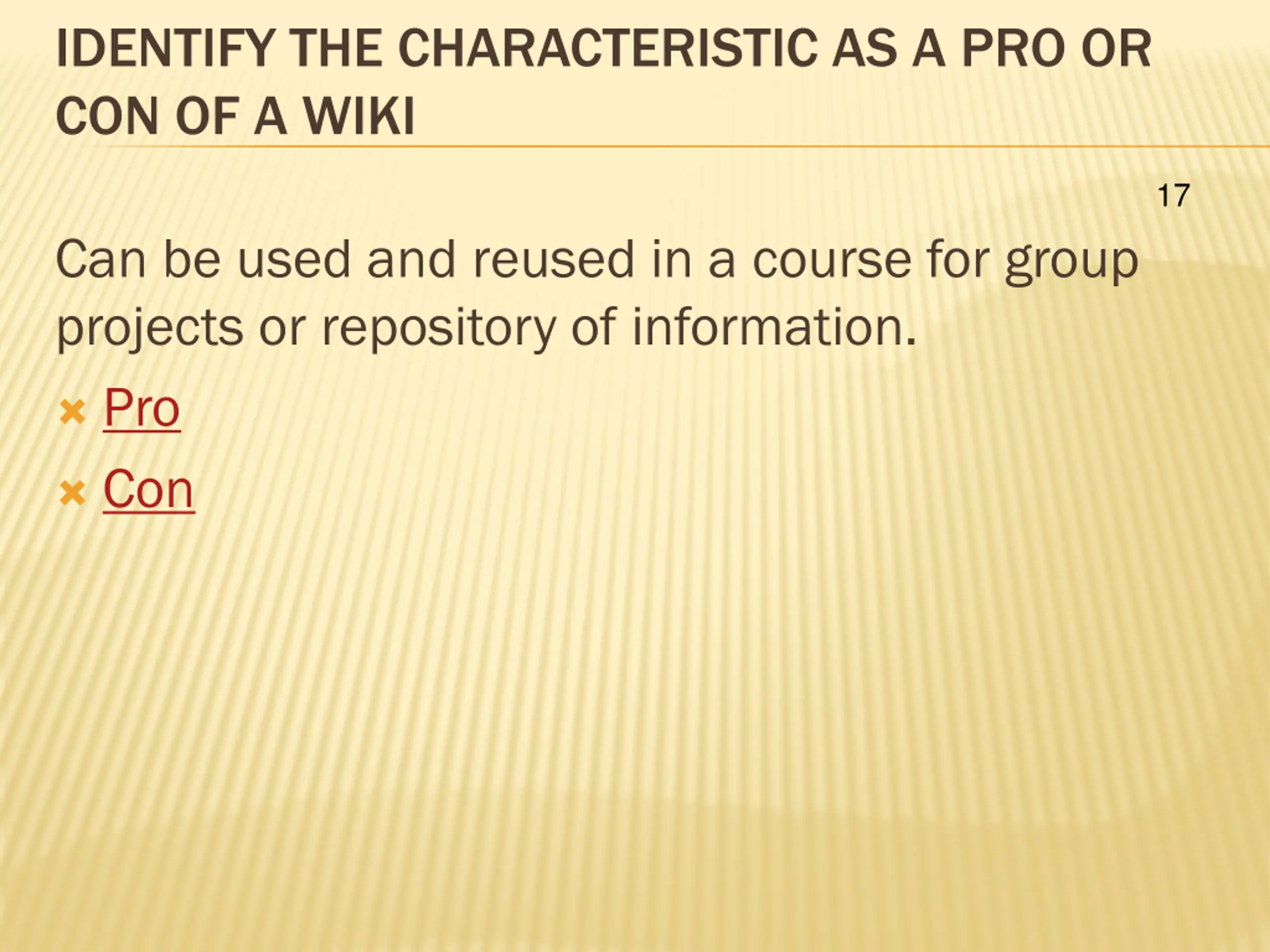IDENTIFY THE CHARACTERISTIC AS A PRO OR CON OF A WIKI 17 Can be used and reused in a course for group projects or repository of information. Pro Con