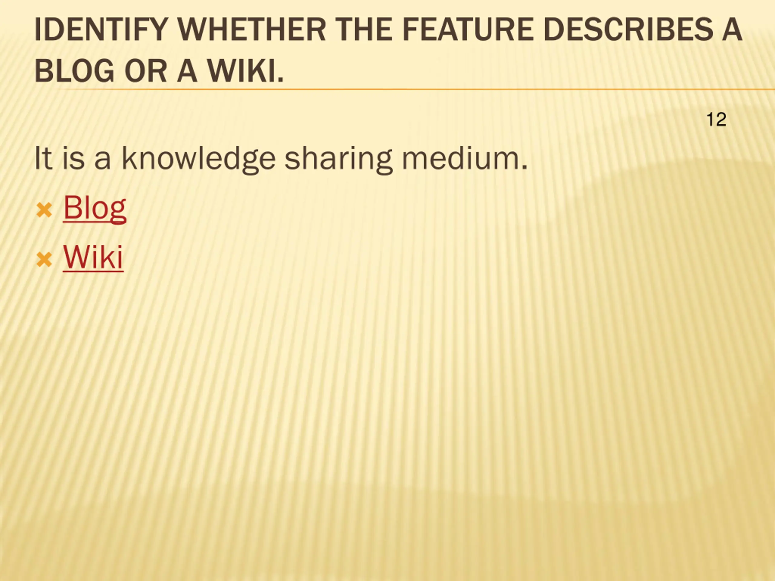 IDENTIFY WHETHER THE FEATURE DESCRIBES A BLOG OR A WIKI. 12 It is a knowledge sharing medium. Blog Wiki