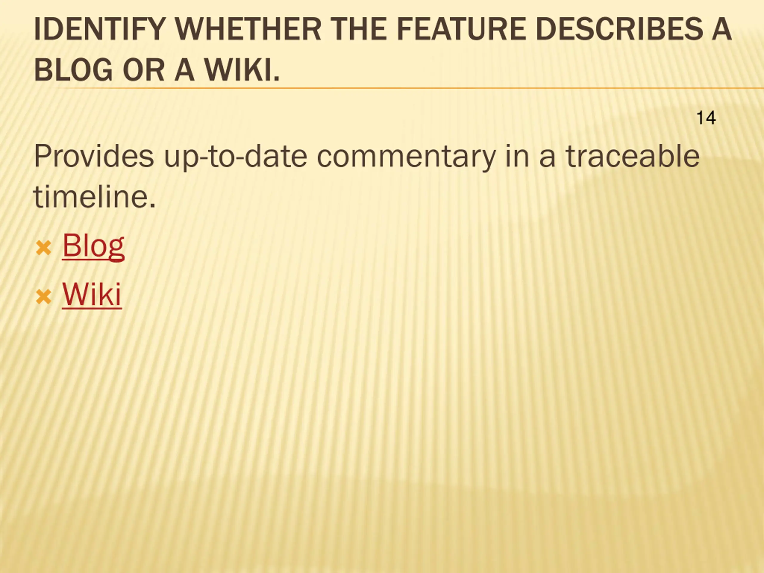 IDENTIFY WHETHER THE FEATURE DESCRIBES A BLOG OR A WIKI. 14 Provides up-to-date commentary in a traceable timeline. Blog Wiki