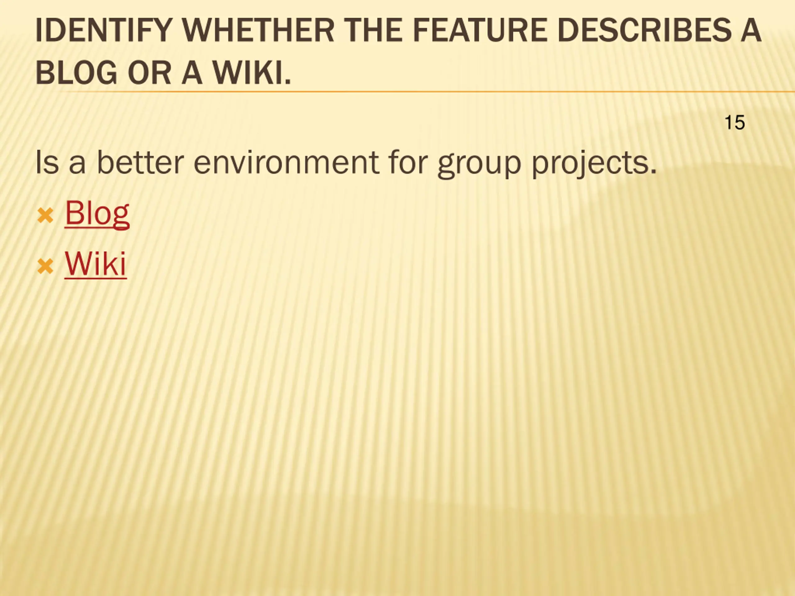 IDENTIFY WHETHER THE FEATURE DESCRIBES A BLOG OR A WIKI. 15 Is a better environment for group projects. Blog Wiki