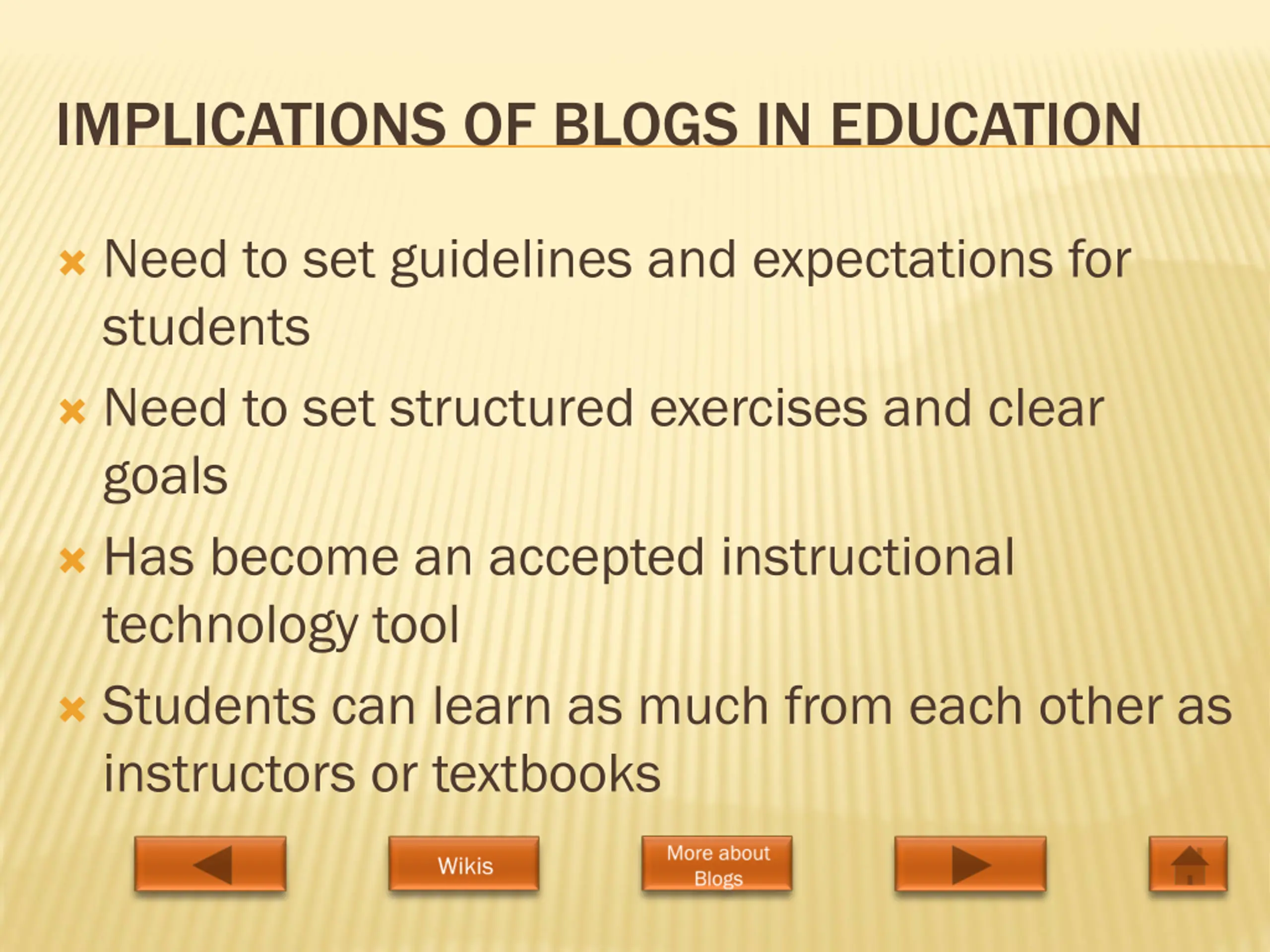 IMPLICATIONS OF BLOGS IN EDUCATION Need to set guidelines and expectations for students Need to set structured exercises and clear goals Has become an accepted instructional technology tool Students can learn as much from each other as instructors or textbooks More about Blogs Wikis
