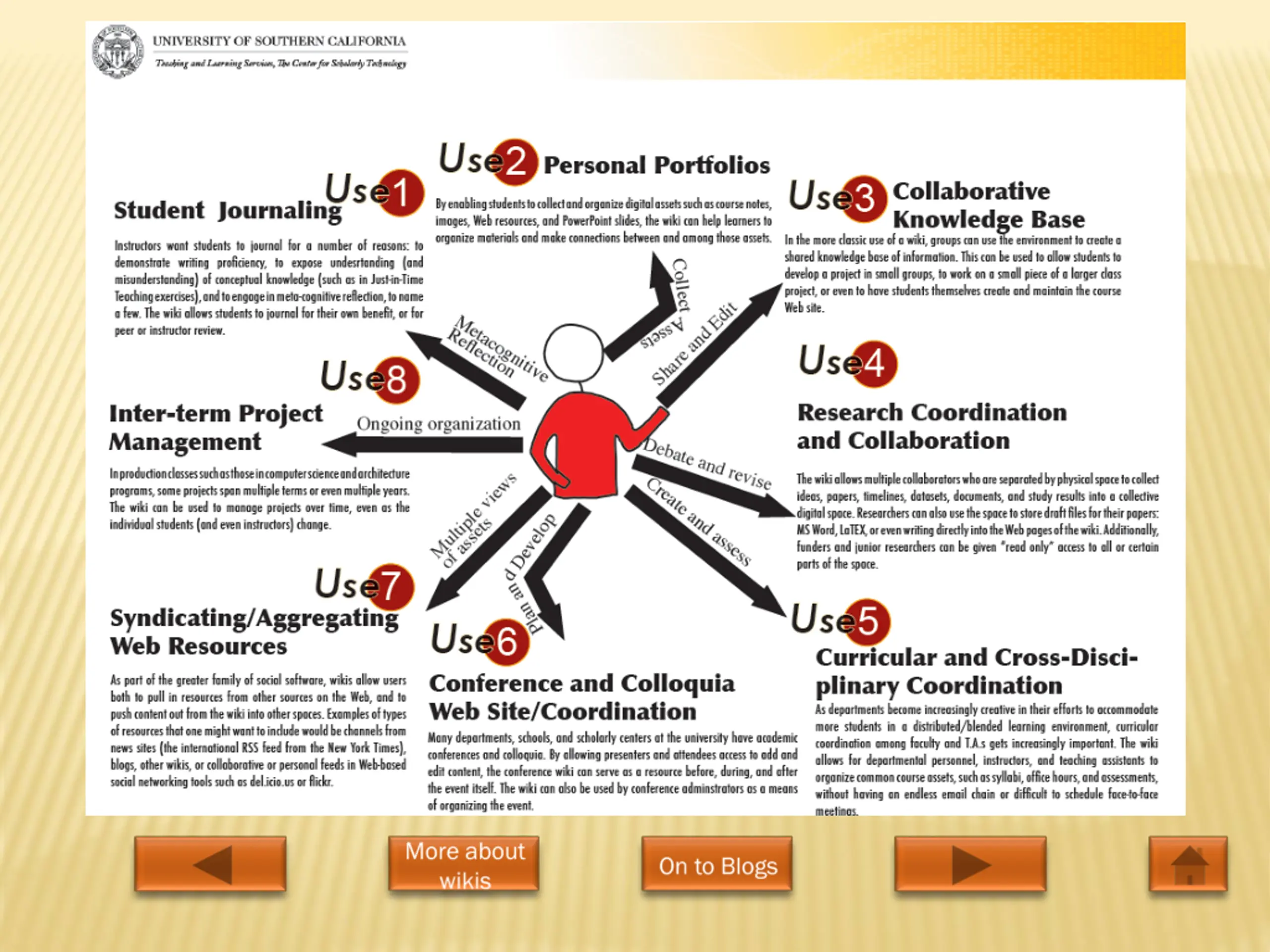 USES Single author Multiple authors on single topic Faculty Express opinions Promote dialog in their discipline Instructional tool Students Personal commentaries Required assignments More about Blogs Wikis