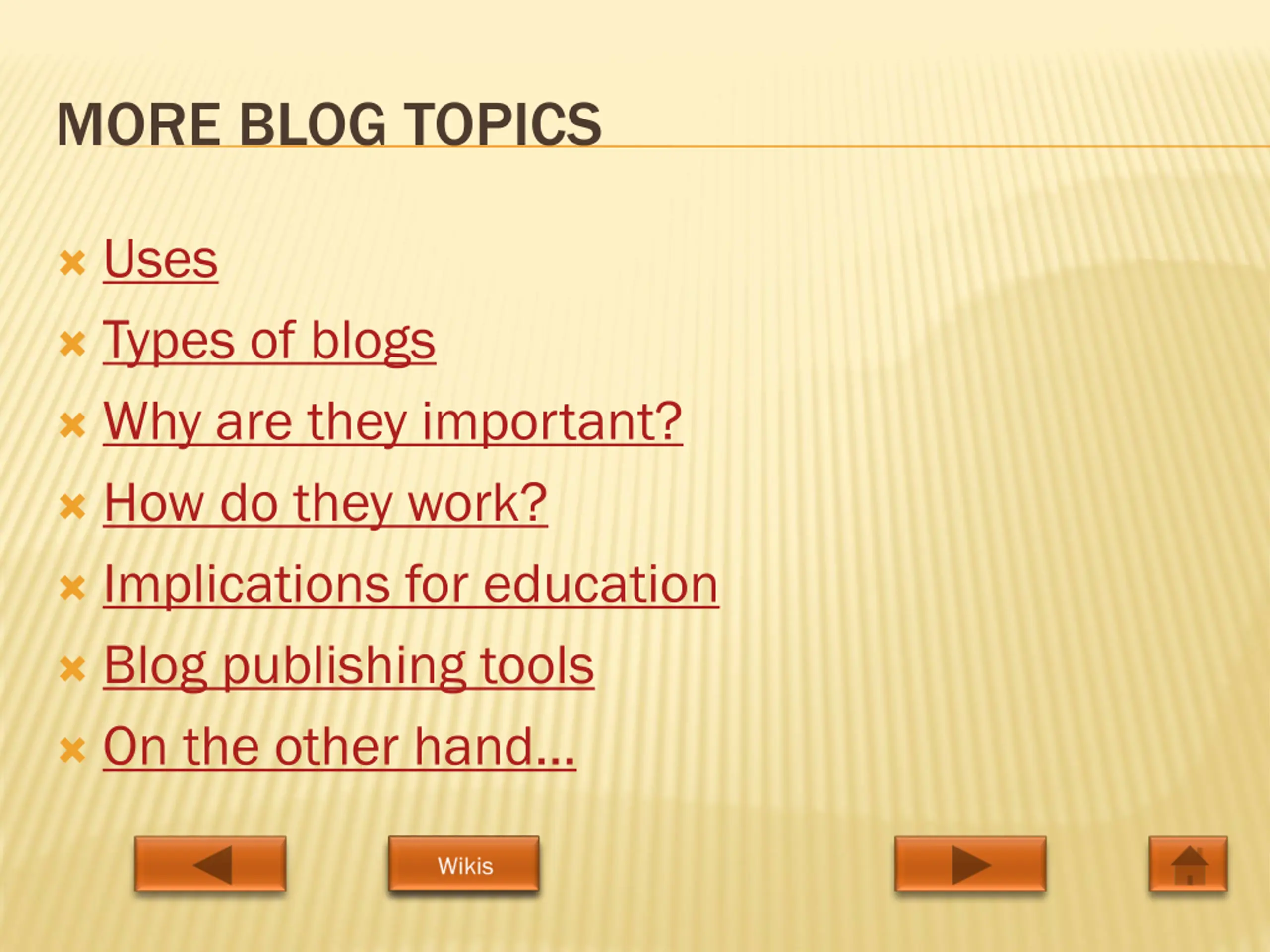 MORE BLOG TOPICS Uses Types of blogs Why are they important? How do they work? Implications for education Blog publishing tools On the other hand On to Wikis Wikis