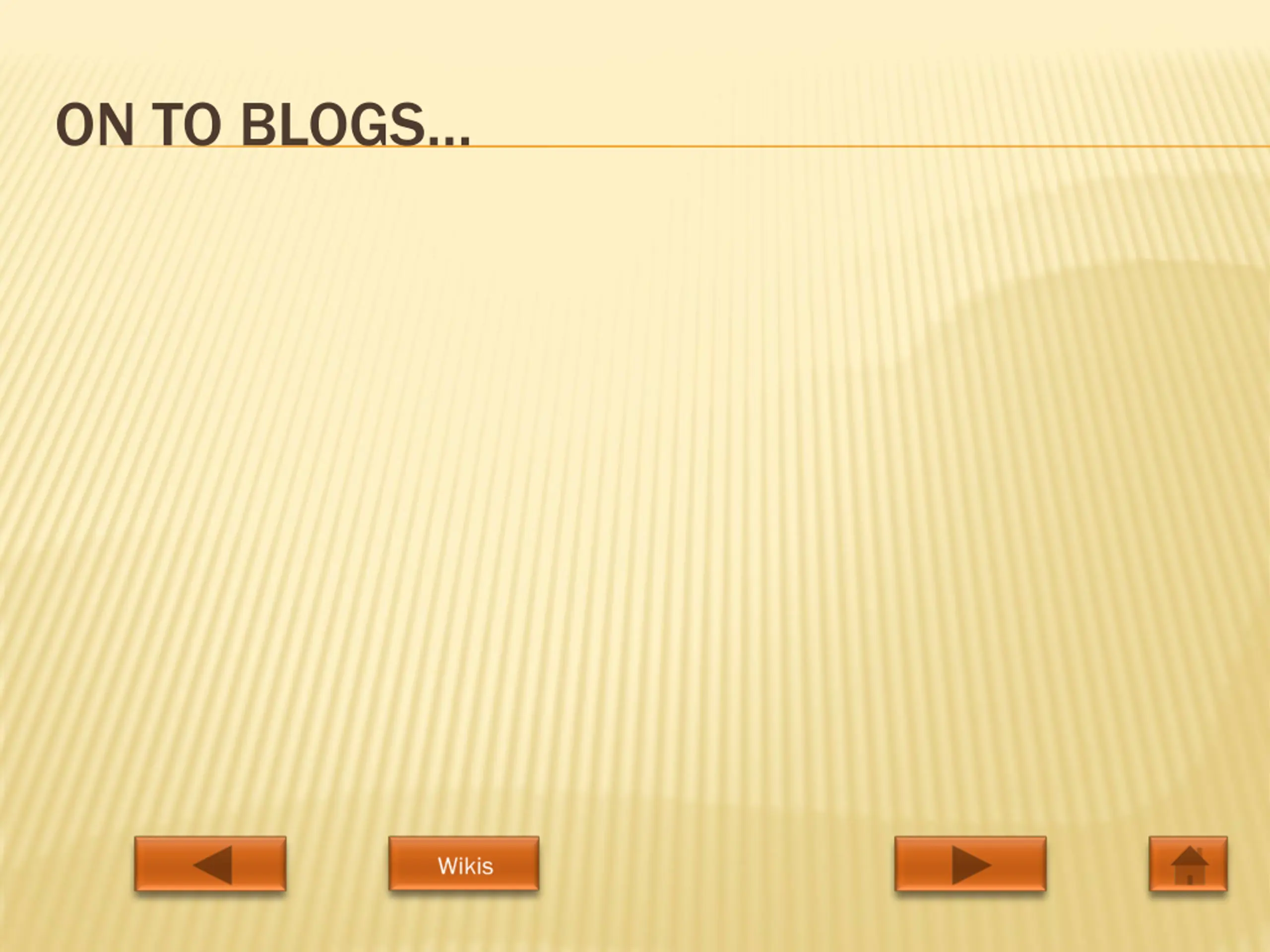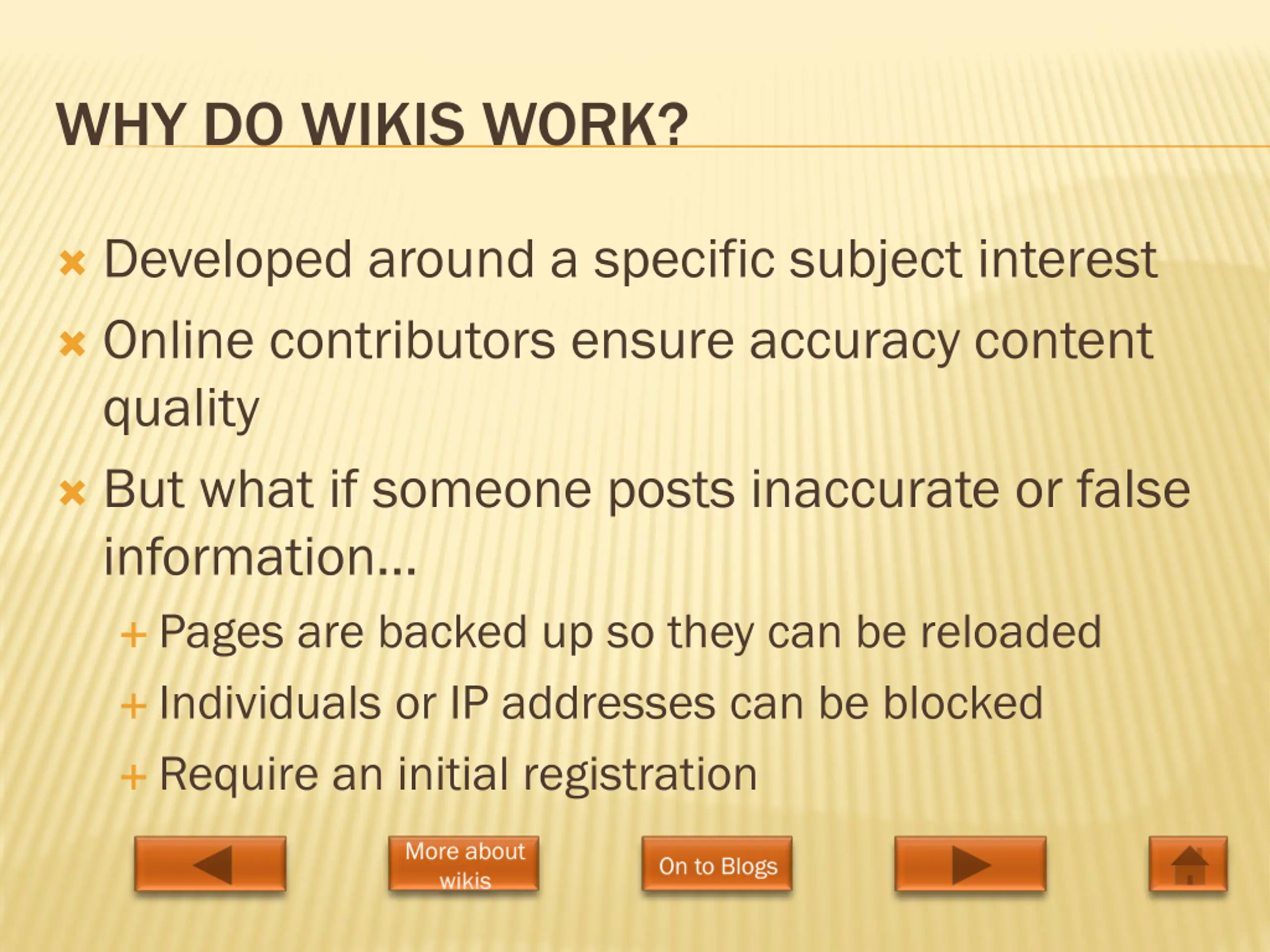 WHY DO WIKIS WORK? Developed around a specific subject interest Online contributors ensure accuracy content quality But what if someone posts inaccurate or false information... Pages are backed up so they can be reloaded Individuals or IP addresses can be blocked Require an initial registration More about wikis On to Blogs