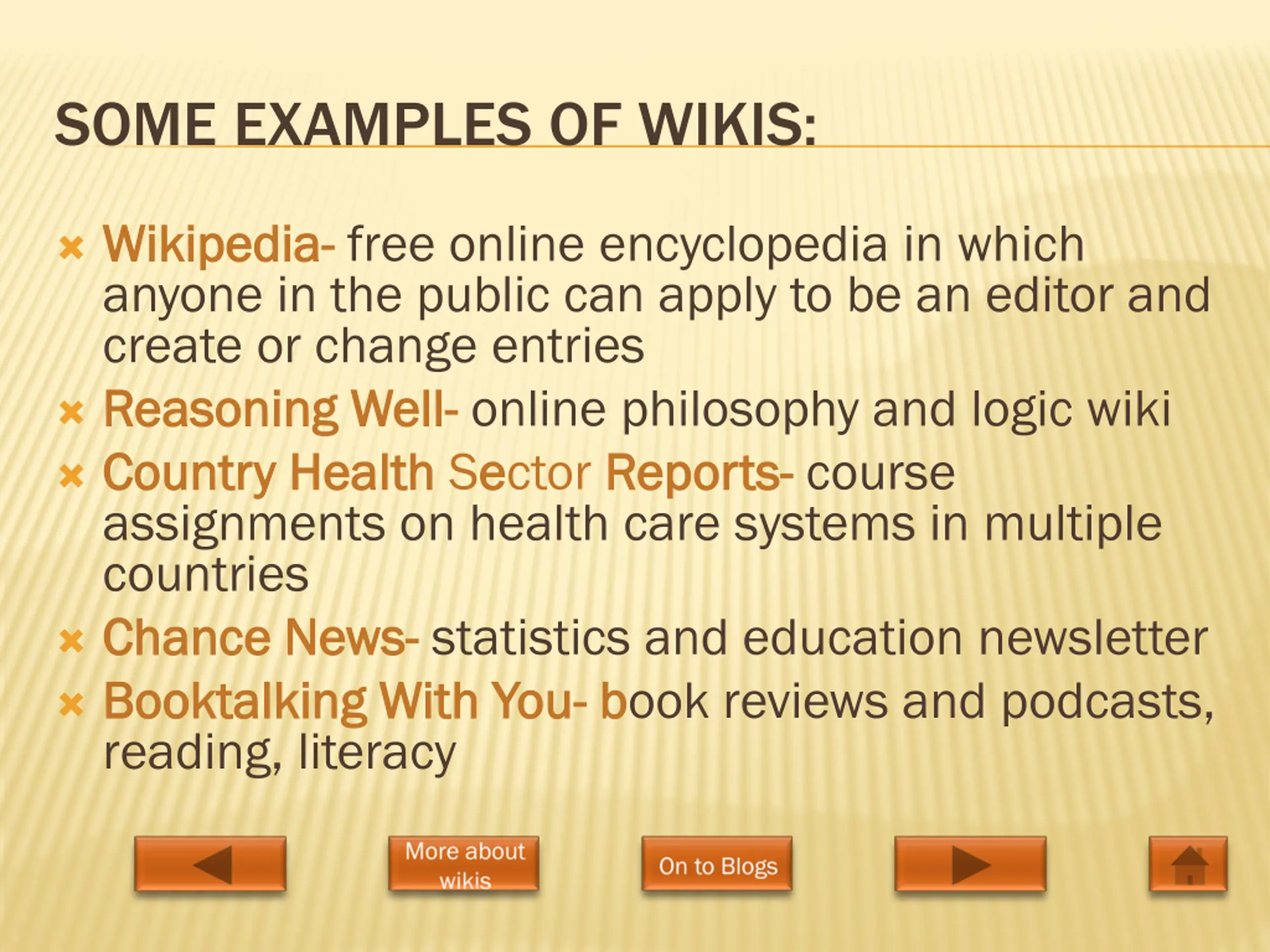 SOME EXAMPLES OF WIKIS: Wikipedia Wikipedia- - free online encyclopedia in which anyone in the public can apply to be an editor and create or change entries Reasoning Reasoning Well Well- - online philosophy and logic wiki Country Country Health Health Se ector Reports Reports- - course assignments on health care systems in multiple countries Chance Chance News News- - statistics and education newsletter Booktalking Booktalking With You With You- - b book reviews and podcasts, reading, literacy More about wikis On to Blogs