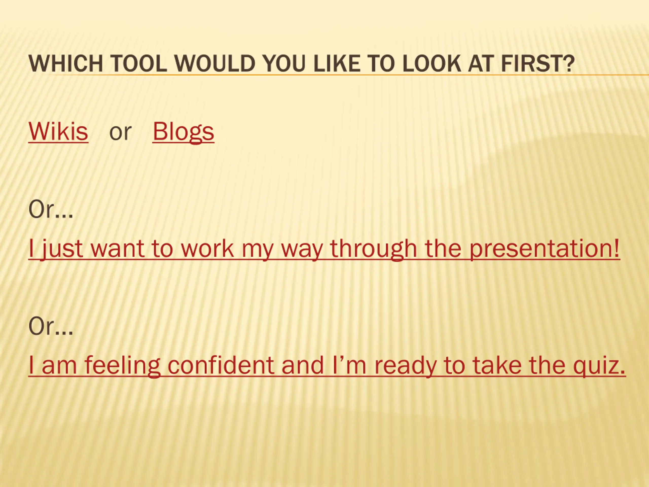 WHICH TOOL WOULD YOU LIKE TO LOOK AT FIRST? Wikis or Blogs Or I just want to work my way through the presentation! Or I am feeling confident and I m ready to take the quiz.