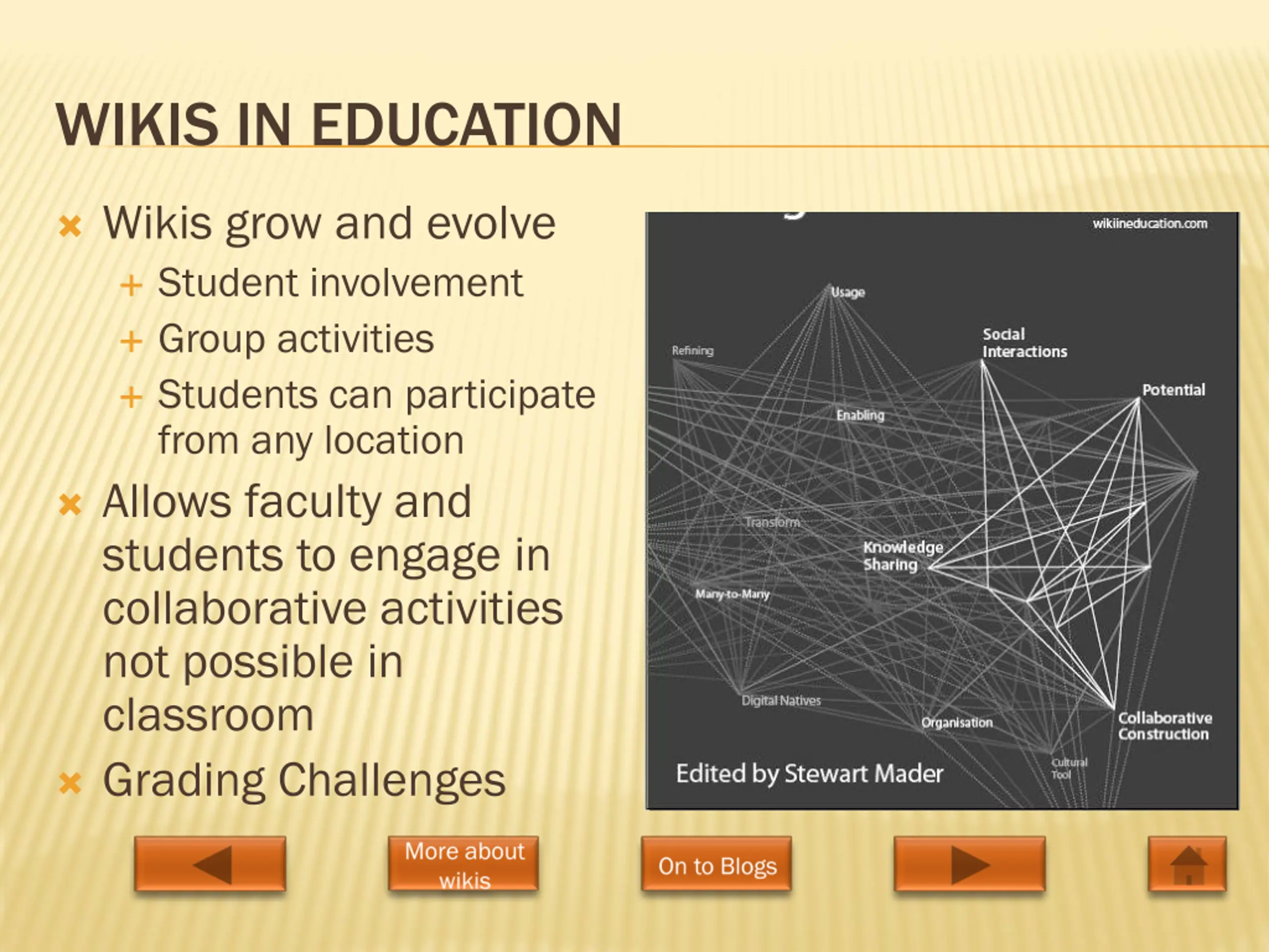 WIKIS IN EDUCATION Wikis grow and evolve Student involvement Group activities Students can participate from any location Allows faculty and students to engage in collaborative activities not possible in classroom Grading Challenges More about wikis On to Blogs