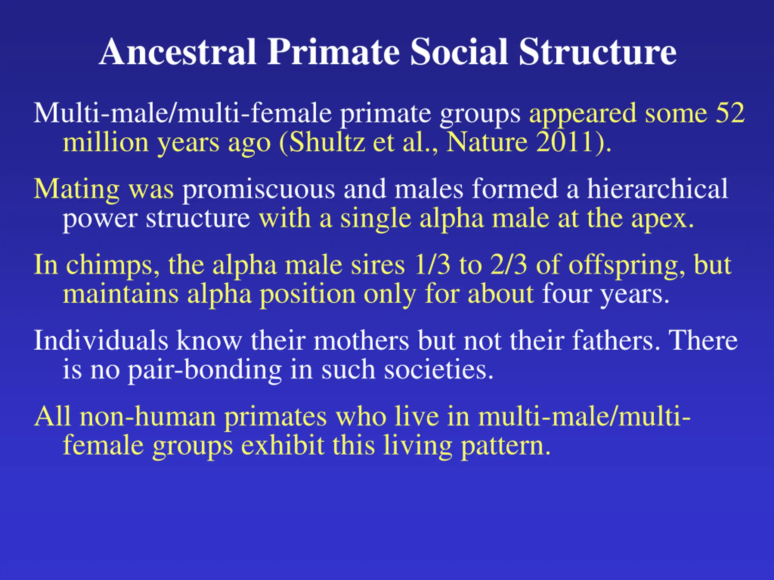 Ancestral Primate Social Structure Multi-male/multi-female primate groups appeared some 52 million years ago (Shultz et al., Nature 2011). Mating was promiscuous and males formed a hierarchical power structure with a single alpha male at the apex. In chimps, the alpha male sires 1/3 to 2/3 of offspring, but maintains alpha position only for about four years. Individuals know their mothers but not their fathers. There is no pair-bonding in such societies. All non-human primates who live in multi-male/multi- female groups exhibit this living pattern.