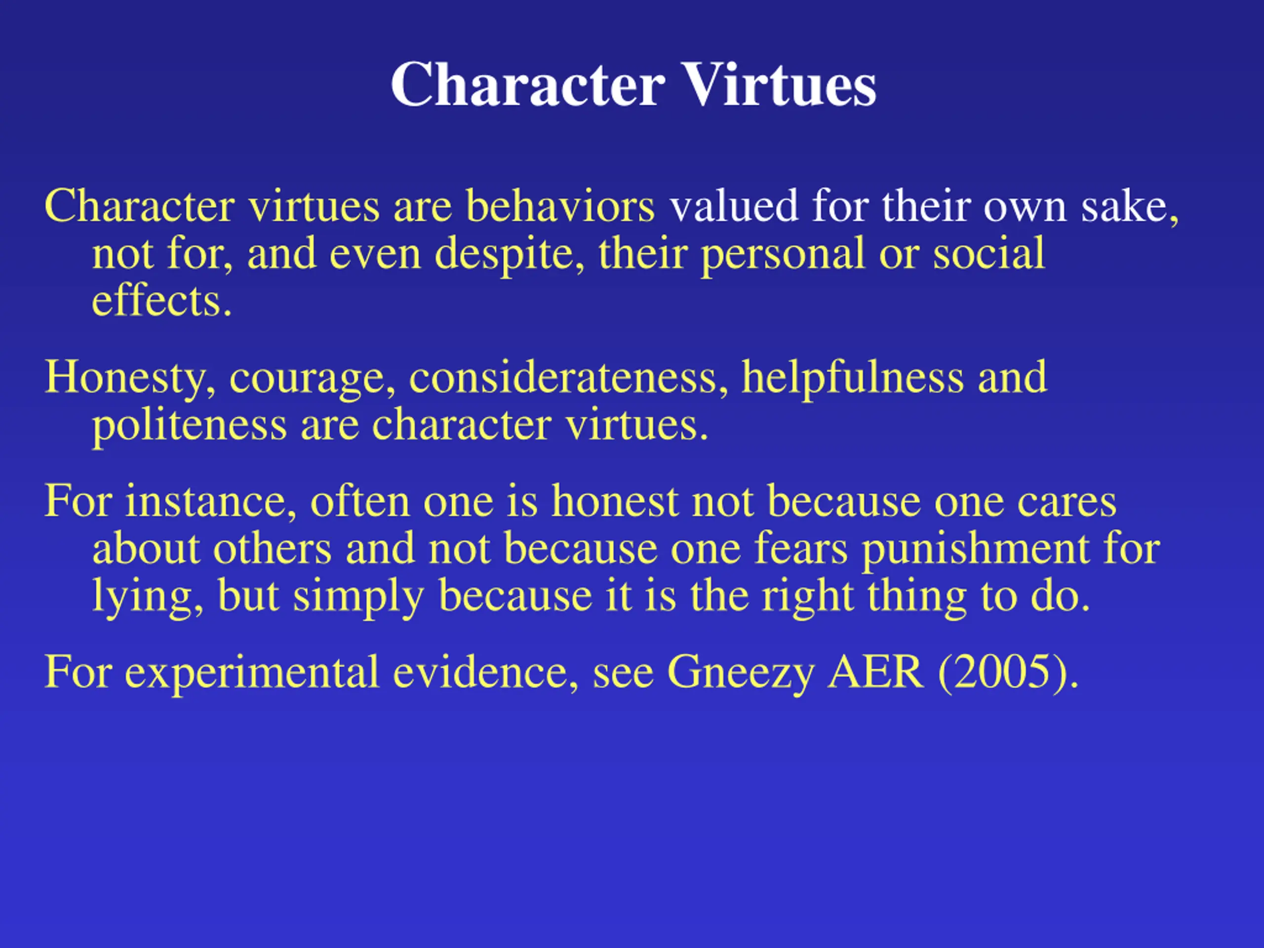 Character Virtues Character virtues are behaviors valued for their own sake, not for, and even despite, their personal or social effects. Honesty, courage, considerateness, helpfulness and politeness are character virtues. For instance, often one is honest not because one cares about others and not because one fears punishment for lying, but simply because it is the right thing to do. For experimental evidence, see Gneezy AER (2005).
