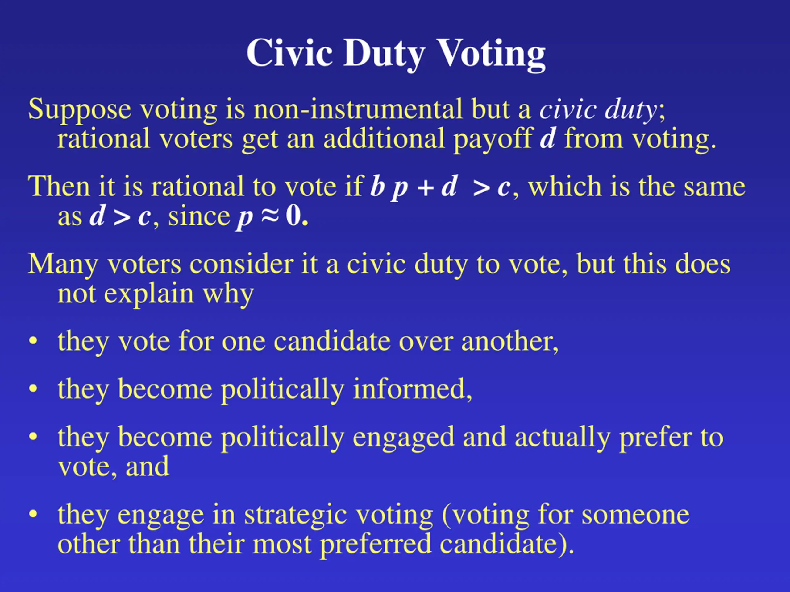 Civic Duty Voting Suppose voting is non-instrumental but a civic duty; rational voters get an additional payoff d from voting. Then it is rational to vote if b p + d > c, which is the same as d > c, since p 0. Many voters consider it a civic duty to vote, but this does not explain why they vote for one candidate over another, they become politically informed, they become politically engaged and actually prefer to vote, and they engage in strategic voting (voting for someone other than their most preferred candidate).