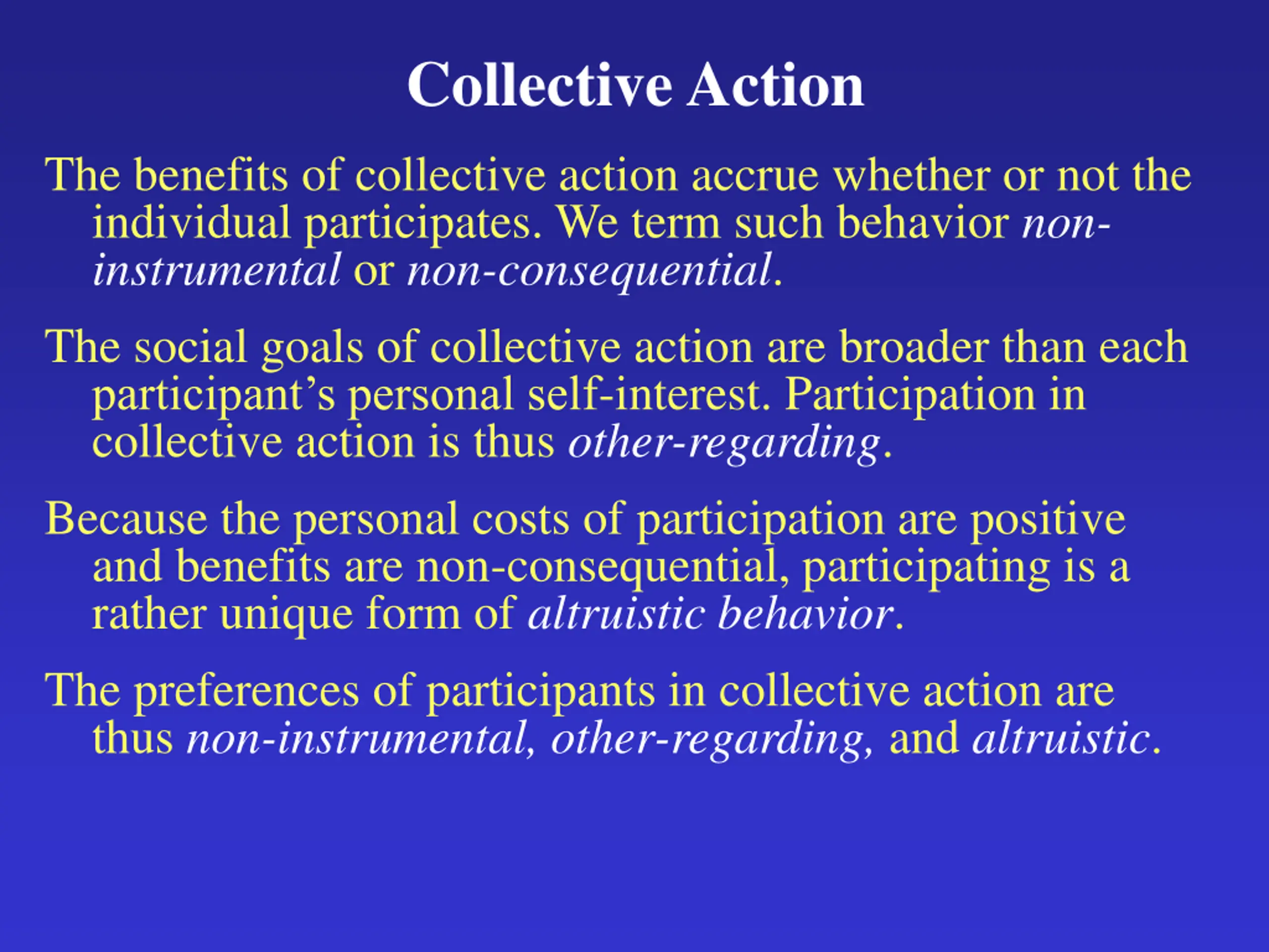 Collective Action The benefits of collective action accrue whether or not the individual participates. We term such behavior non- instrumental or non-consequential. The social goals of collective action are broader than each participant s personal self-interest. Participation in collective action is thus other-regarding. Because the personal costs of participation are positive and benefits are non-consequential, participating is a rather unique form of altruistic behavior. The preferences of participants in collective action are thus non-instrumental, other-regarding, and altruistic.