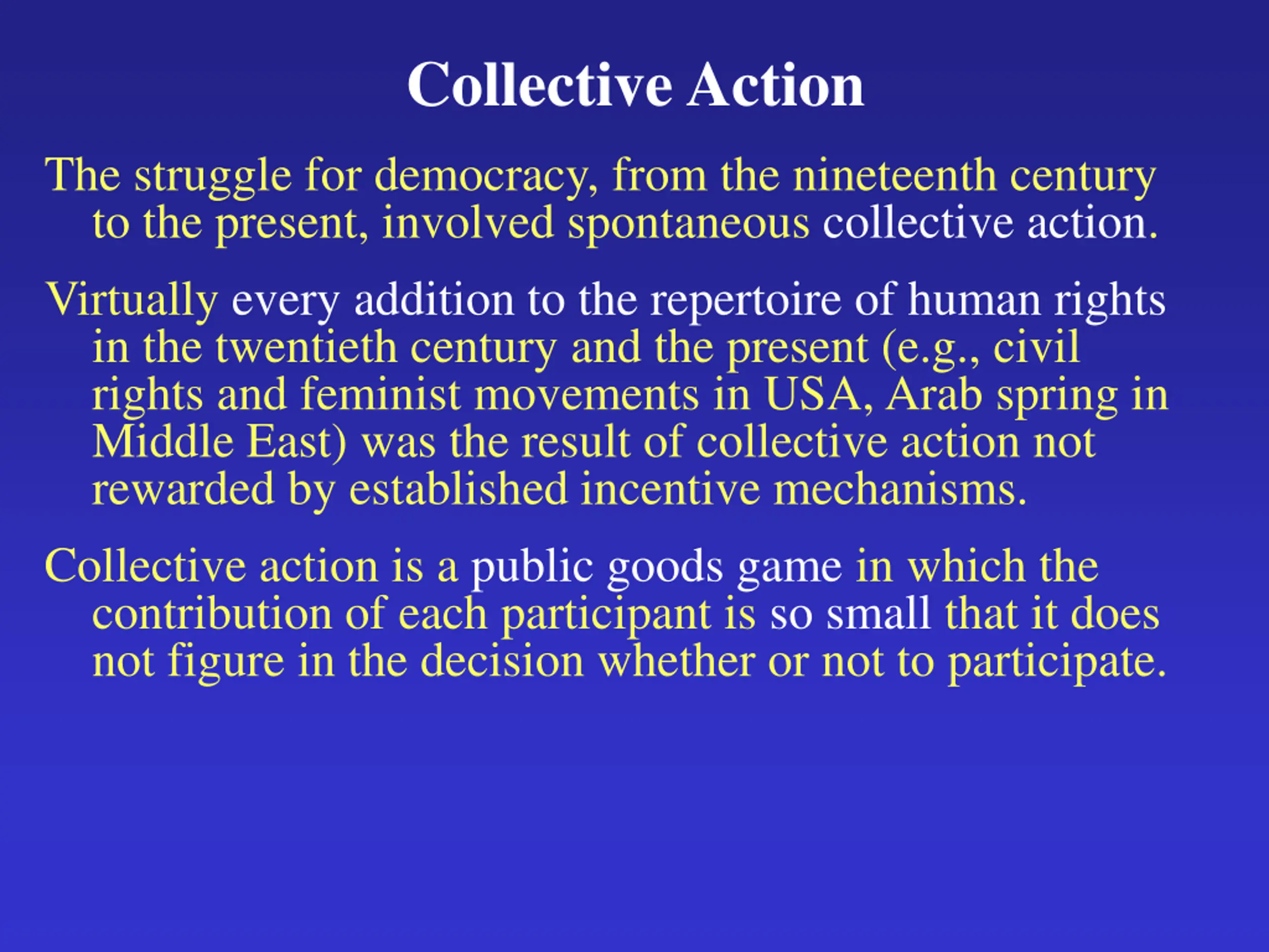 Collective Action The struggle for democracy, from the nineteenth century to the present, involved spontaneous collective action. Virtually every addition to the repertoire of human rights in the twentieth century and the present (e.g., civil rights and feminist movements in USA, Arab spring in Middle East) was the result of collective action not rewarded by established incentive mechanisms. Collective action is a public goods game in which the contribution of each participant is so small that it does not figure in the decision whether or not to participate.