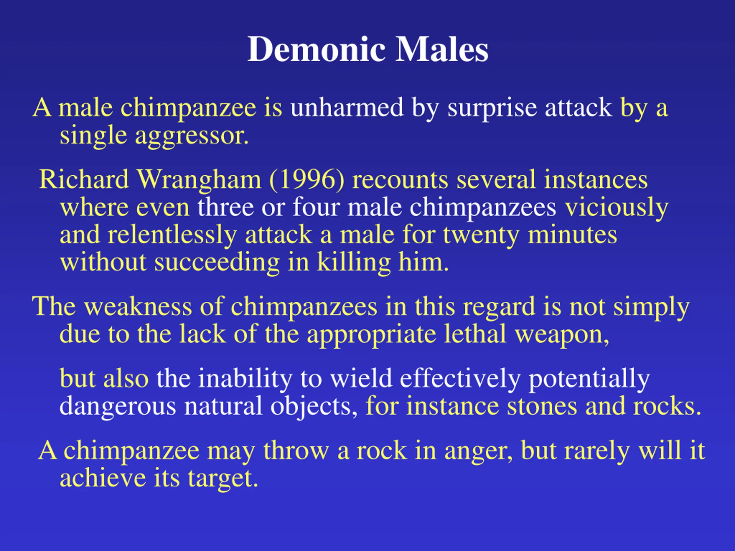 Demonic Males A male chimpanzee is unharmed by surprise attack by a single aggressor. Richard Wrangham (1996) recounts several instances where even three or four male chimpanzees viciously and relentlessly attack a male for twenty minutes without succeeding in killing him. The weakness of chimpanzees in this regard is not simply due to the lack of the appropriate lethal weapon, but also the inability to wield effectively potentially dangerous natural objects, for instance stones and rocks. A chimpanzee may throw a rock in anger, but rarely will it achieve its target.